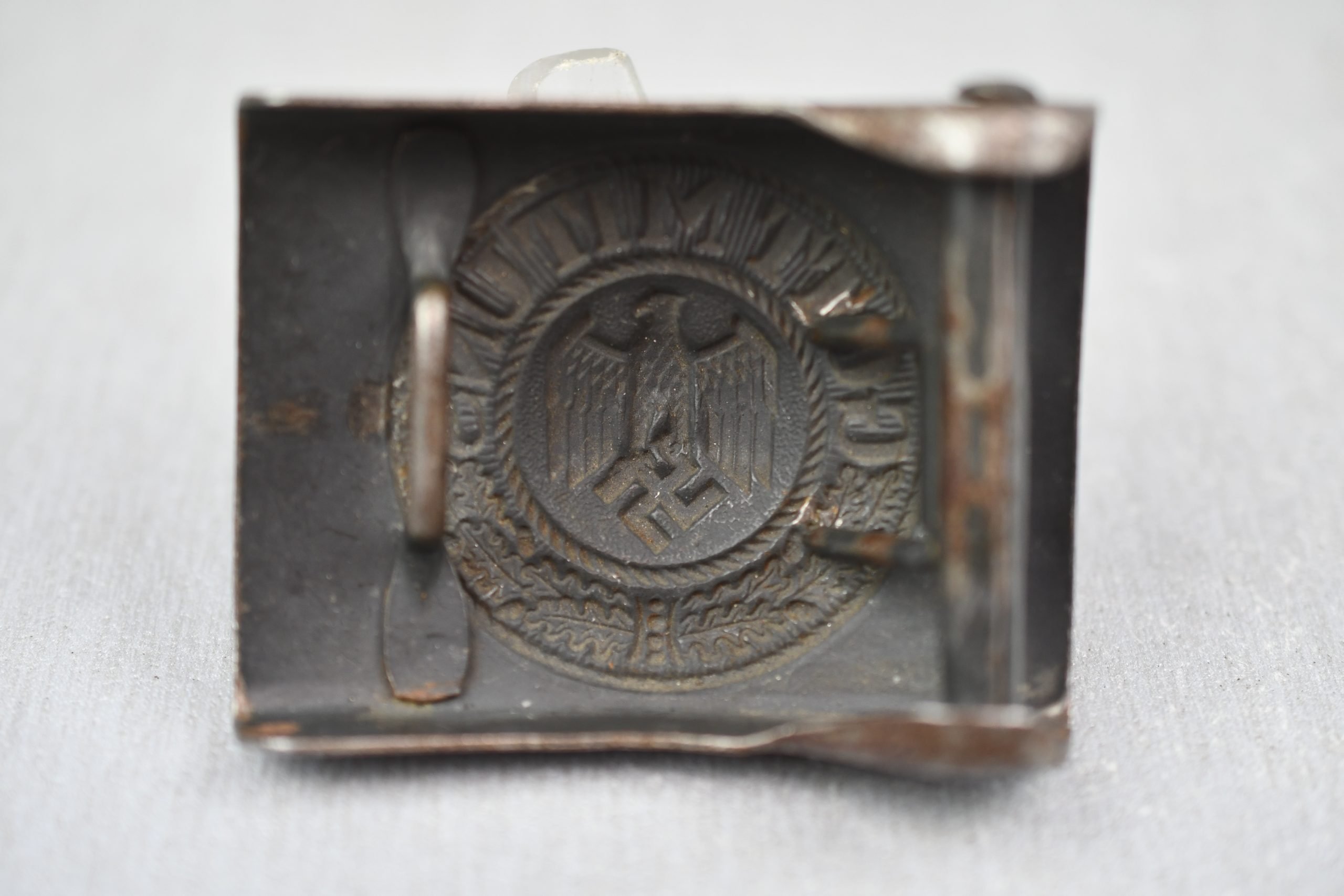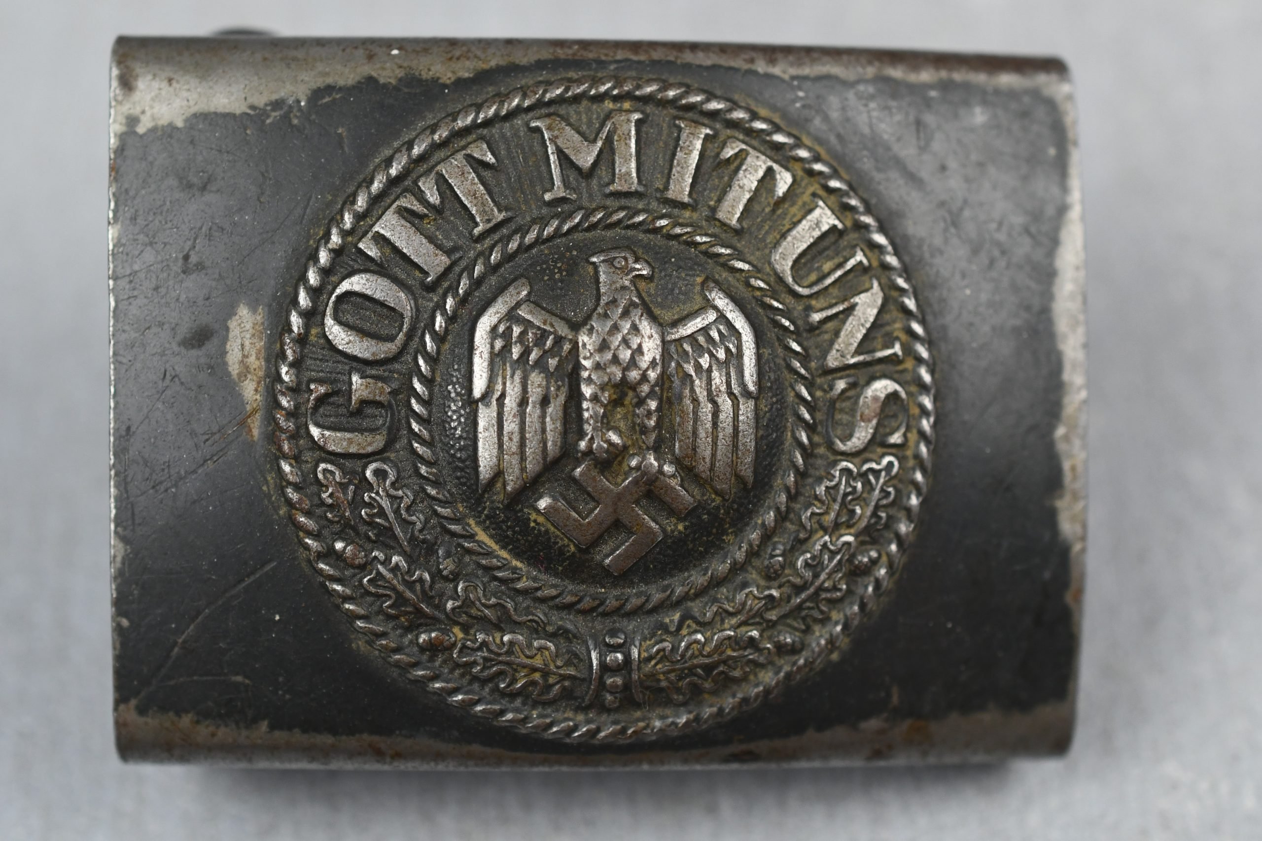 Standard issue army (or Navy/Kriegsmarine) belt buckle exectuted in steel, coated in field grey paint. No maker mark to be found. Light worn buckle in good condition!