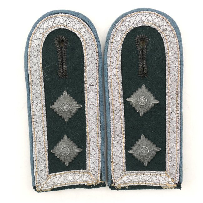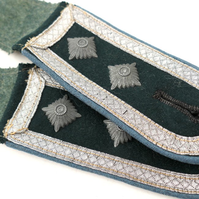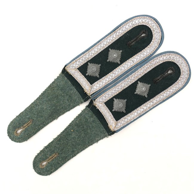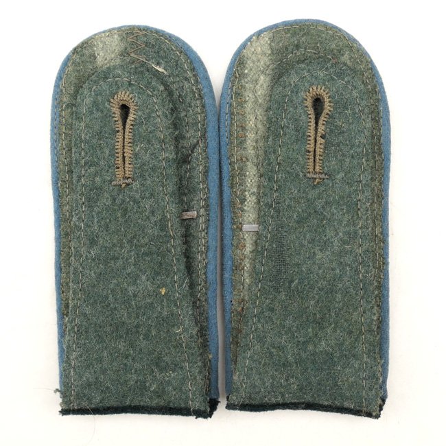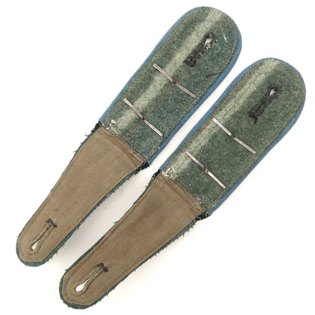This is a very nice matching pair of Wehrmacht (Heer) 'M36' type shoulder-straps (Schulterklappen) having the light-blue coloured wool-type piping as intended for an 'Oberfeldwebel der Nachschub-Truppen' (Transport Troops). The boards are fully textbook and are executed in dark-green wool having the standard silver-coloured NCO braid attached. Both boards are having two matching silver-coloured pips attached indicating the rank of 'Oberfeldwebel'. Both boards come on their functional tongues, the straps are measuring approximately 10,5 cms in length. Nice original pair of transport troops shoulder-straps in very good condition, perfect to complete an M36 tunic with!