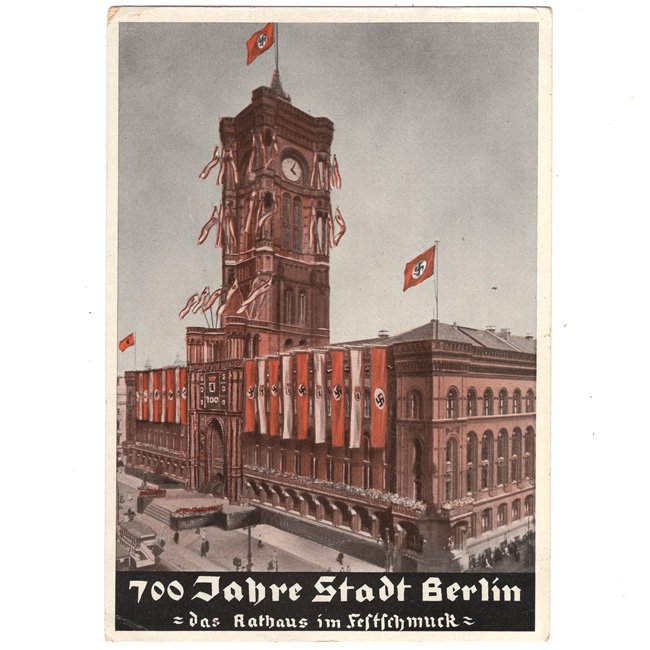This is a nice original period '700 Jahre Stadt Berlin' propaganda postcard (Postkarte) showing the 'Rotes Rathaus' (Red Town Hall), the town hall of Berlin. The postcard measures approximately 15 x 10,5 cms in size and is in good condition (some minor damage to the corners), see scans. Nice and decorative color postcard!