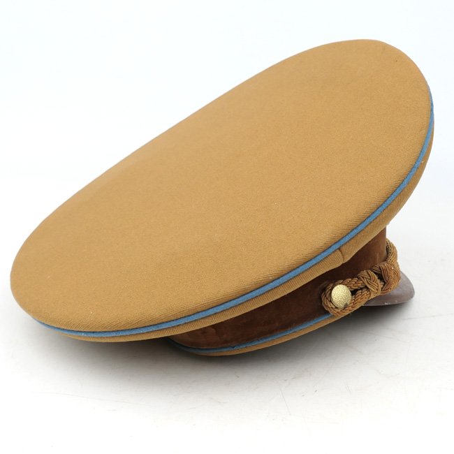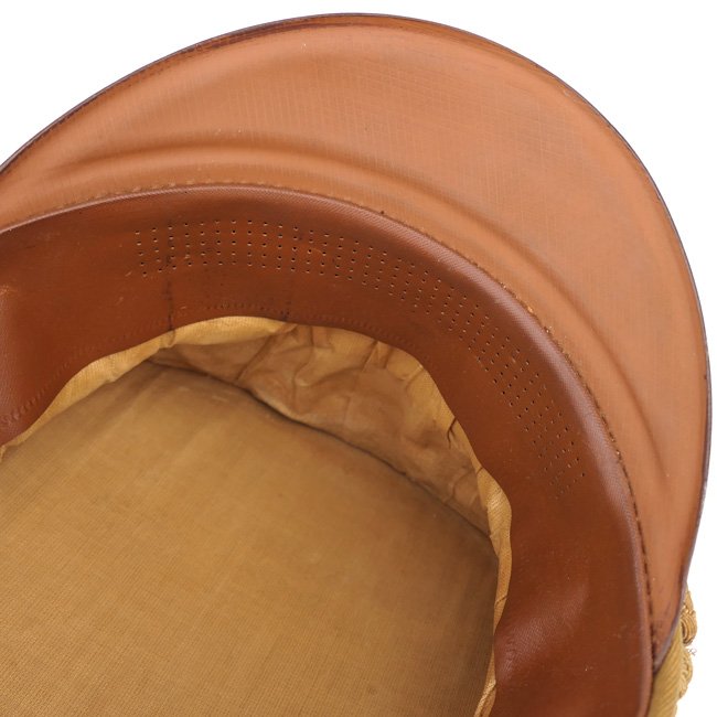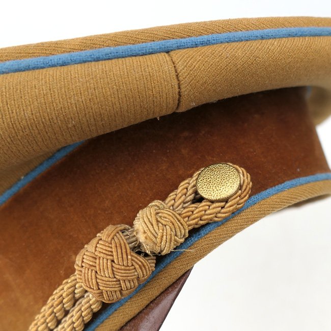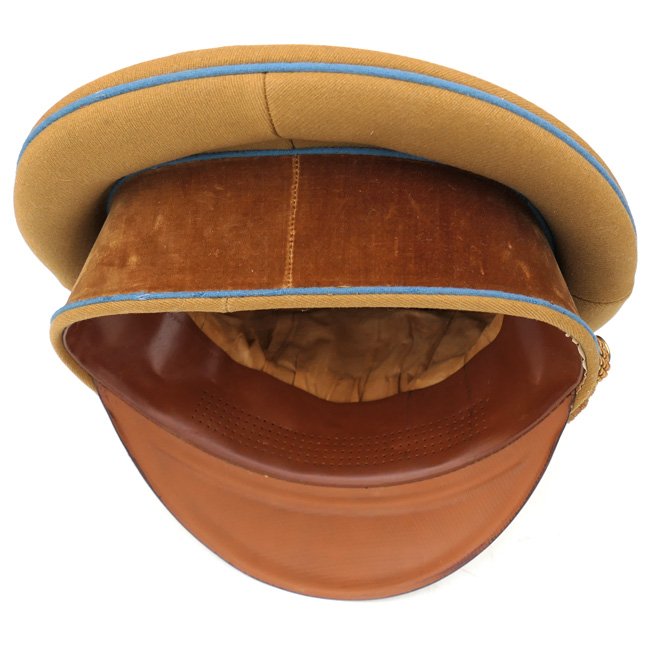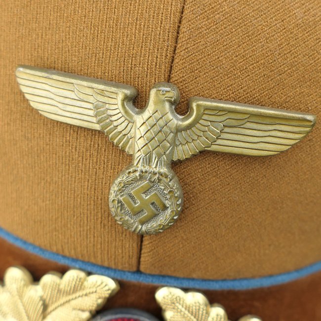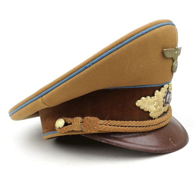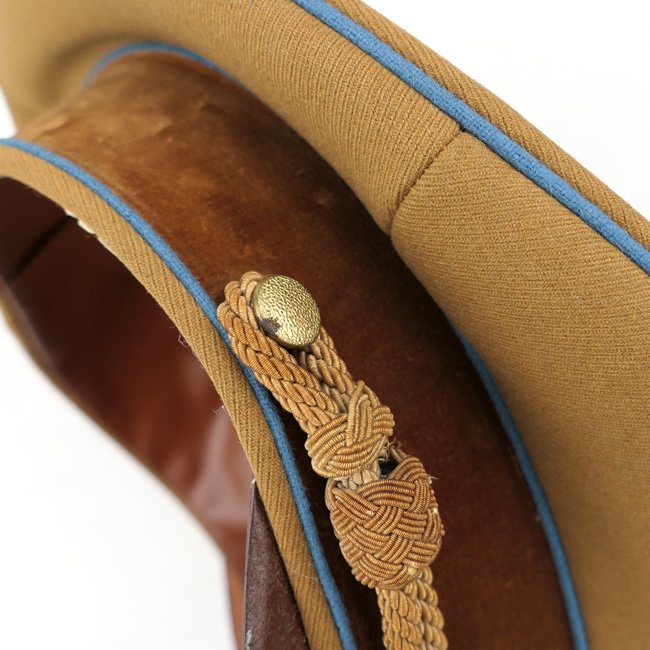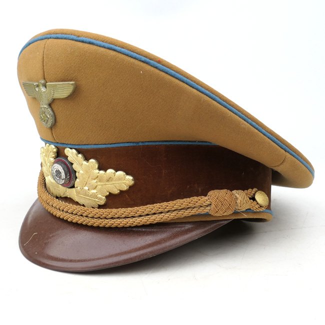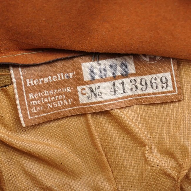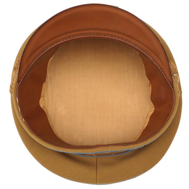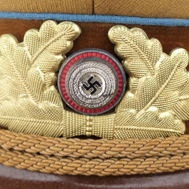 NSDAP Ortsgruppe Level Political Leader's Visor Cap (Schirmmรผtze fรผr Politische Leiter der Ortsgruppenleitung). In January 1934 the NSDAP introduced a visor cap, based on the army style visor cap. The NSDAP was structured in four ascending levels of government, consisting of the 'Ortsgruppenleitung,' the 'Kreisleitung,' the 'Gauleitung,' and the 'Reichsleitung,' with each group being distinguished by a specific colour of piping. This is a nice quality issue brown coloured Political Leader's Visor Cap, the cap is piped in the blue 'Waffenfarbe' indicating a political leader in the Ortsgruppe Level. The interior of the cap is lined in orange-brown oilcloth. The brown simulated leather sweatband is in very good condition, there is a nice RZM tag beneath the sweatband and the cap is size '55' marked. The cap is complete with its original gold finished political cap-eagle and cocarde. The pet is having a gold coloured chinstrap. The cap shows only minor traces of storage and is in overal very good near mint condition. Stunning original Ortsgruppe Level Political Leader's Visor Cap!