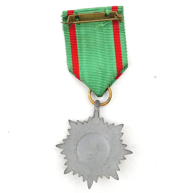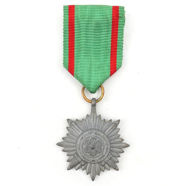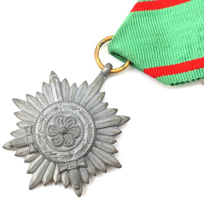 Eastern Peoples Award 2nd Class in Gold with Swords (Verdienstauszeichnung für Angehörige der Ostvölker, 2. Klasse in Gold). This series of awards was instituted on 14 July 1942 to recognize the contribution of volunteers from the Eastern European countries to Germany's war effort. The zinc type medal just shows some minor wear and great detail overall, it lost most of its original gold finish. The medal is complete with its original confectioned red/green ribbon as found. The medal is nicely maker marked with number '100' indicating production by the company of 'Wächtler & Lange' from Mittweida. Nice example in good condition!