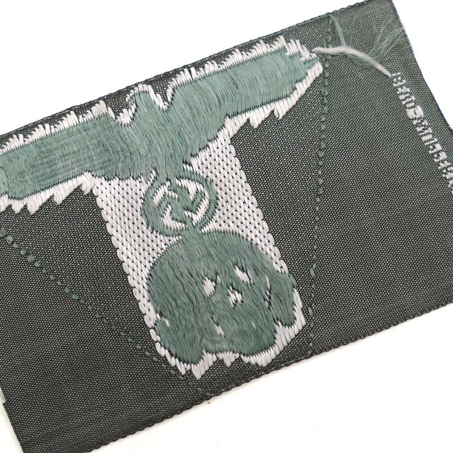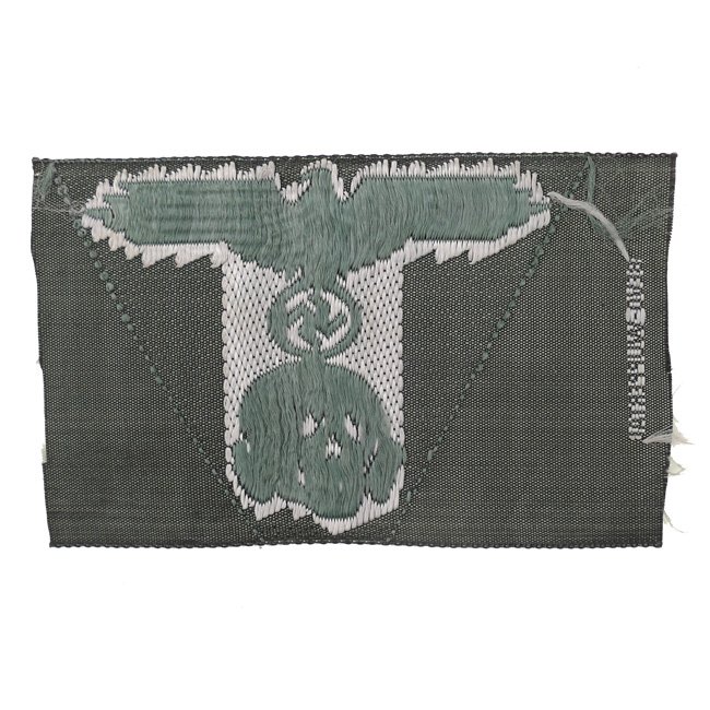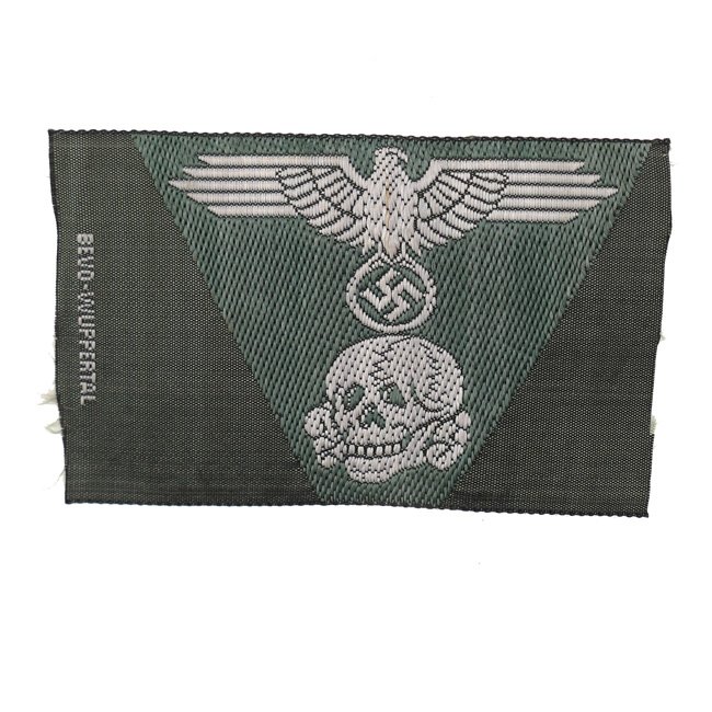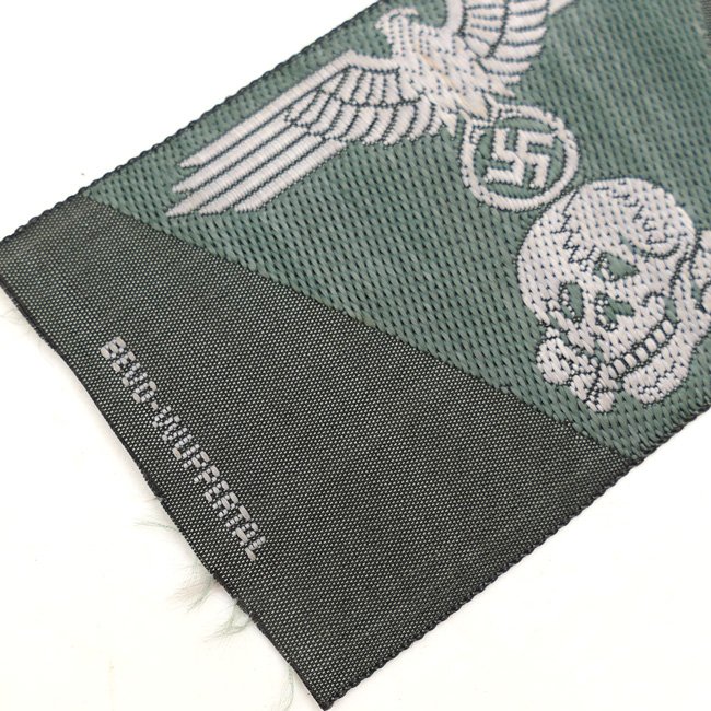 This is a nice Waffen-SS M43 Cap Trapezoid, executed in the so-called BeVo-weave pattern. In 1944 the SS developed a single piece of cap insignia which incorporated both the skull and eagle on a one piece trapezoid base for wear on the M43 field cap. Originally these trapezoidal pieces of insignia were produced in a machine woven version until a final, embroidered version was introduced in late 1944. The first versions of the trapezoidal cap insignia featured dual rows of teeth in the skull while later versions only had a single row of teeth. This is an early dual row version. This BeVo machine woven version of the trapezoid was to be worn by EM/NCO's. The trapezoid is executed in silver-grey linnen on a fieldgrey linnen background. The trapezoid is nicely maker marked with 'BeVo-Wuppertal. Nice original example in mint and unissued condition!