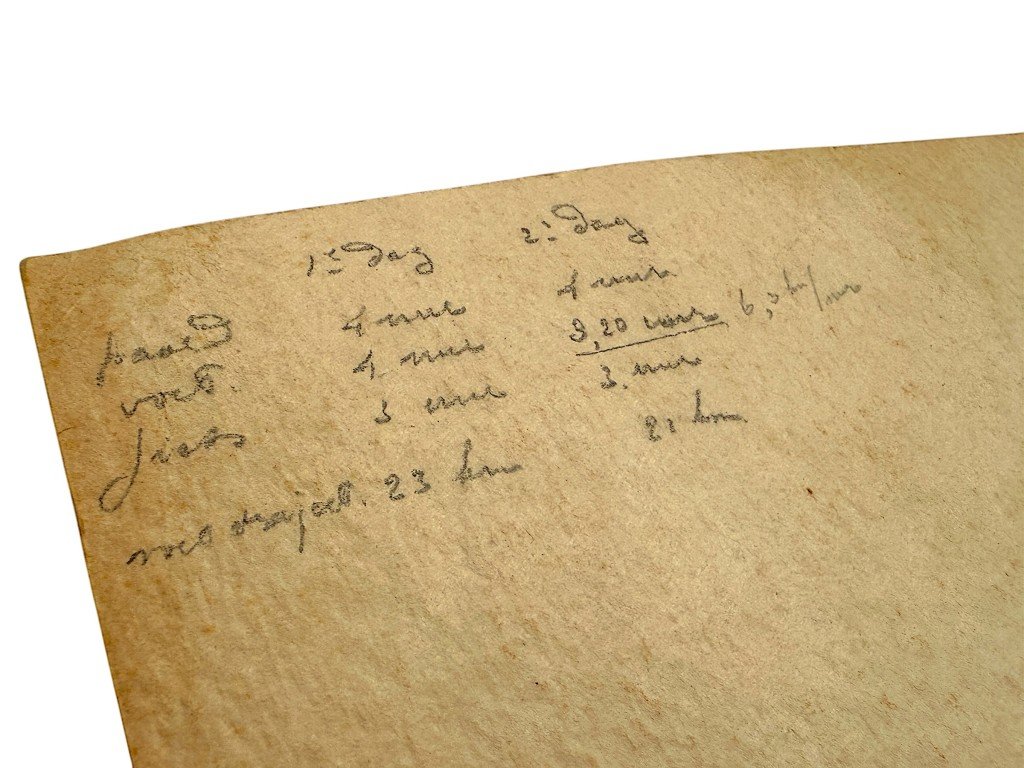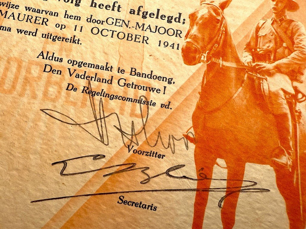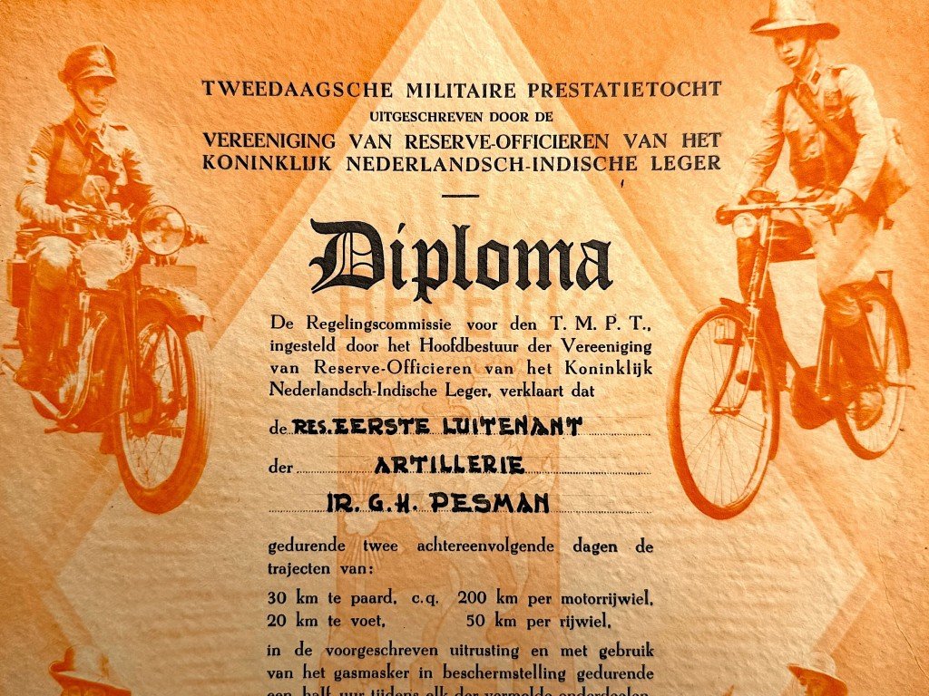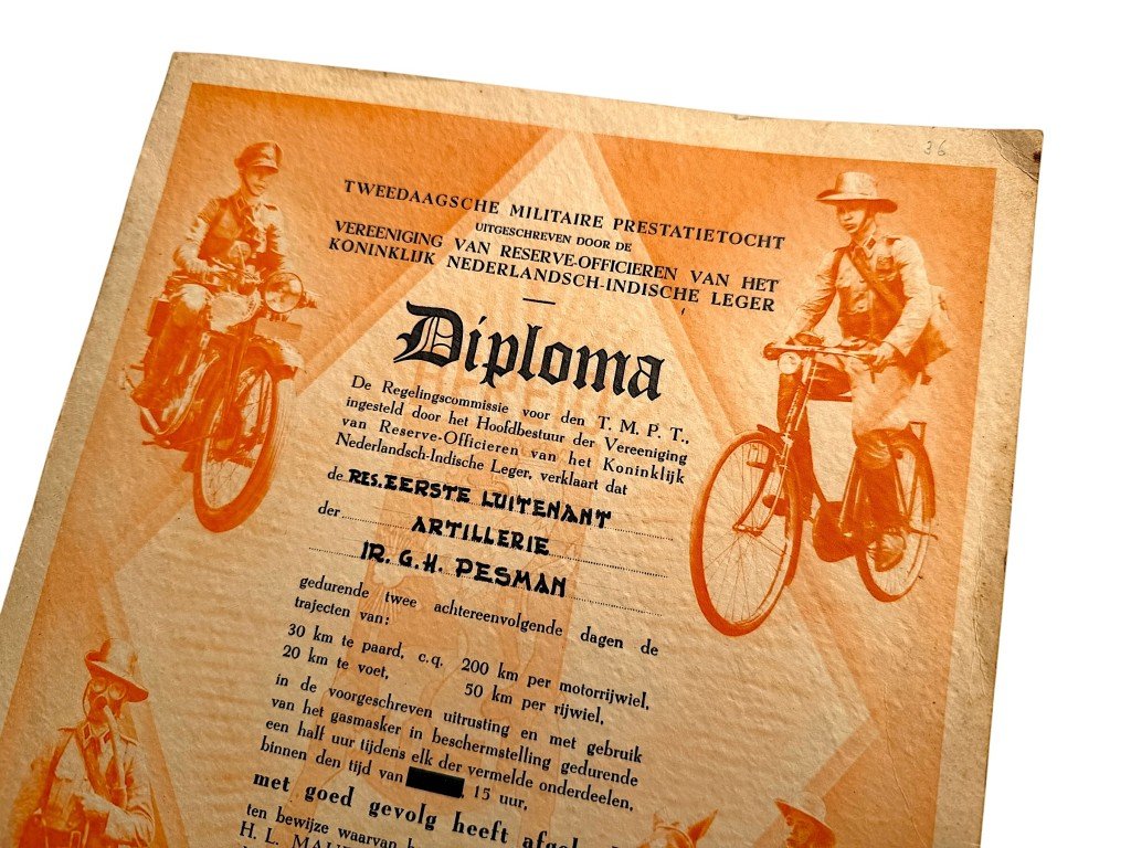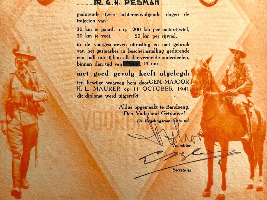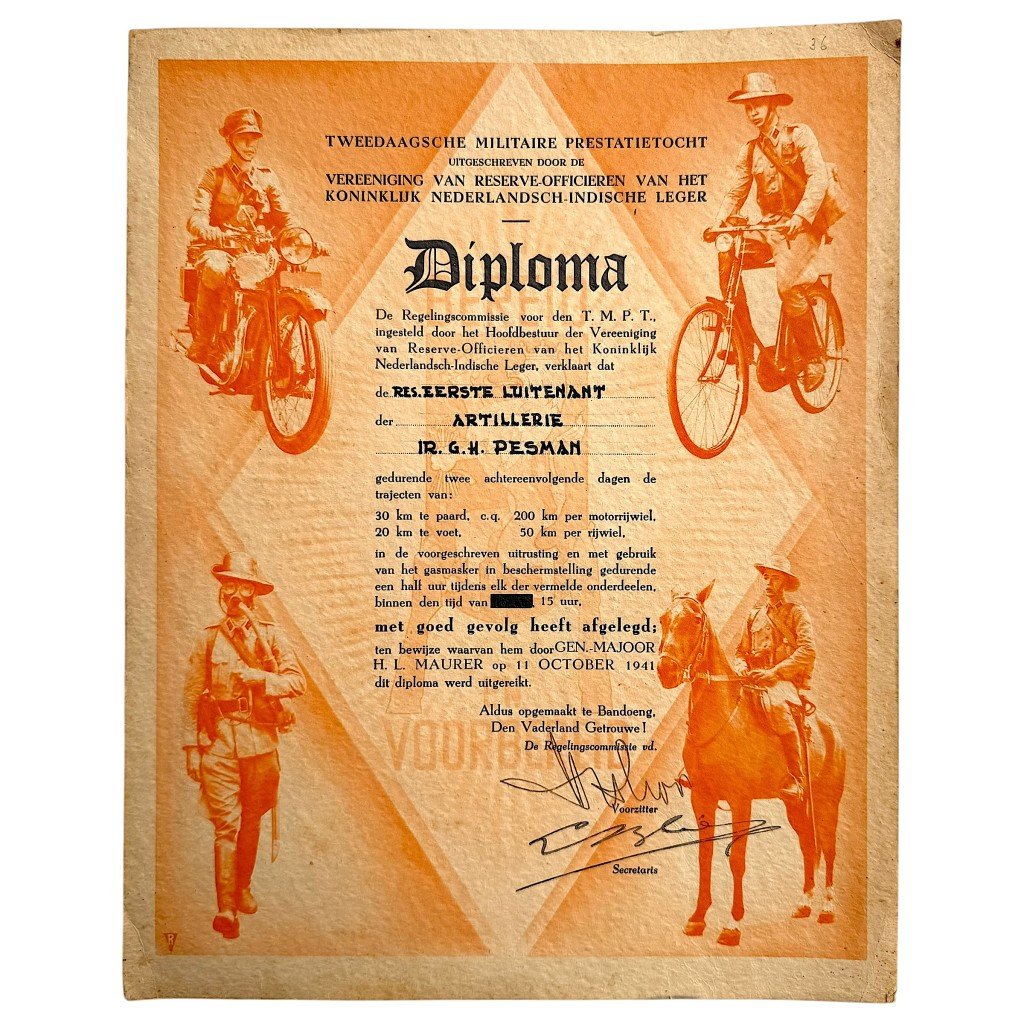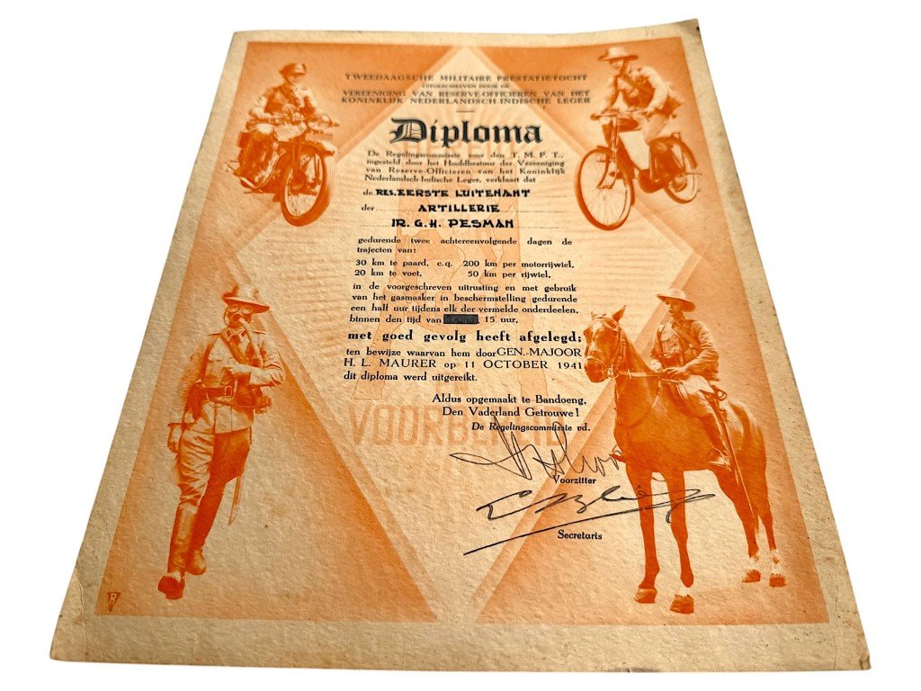 This is a KNIL certificate from 1941 and the diploma was awarded to Reserve First Lieutenant of Artillery Ir. G.H. Pesman of the Royal Netherlands East Indies Army.The document was issued by the 'Association of Reserve Officers of the KNIL' and granted for the successful completion of the two-day military performance march.The march included 30 km on horseback, 200 km by motorcycle, 20 km on foot, and 50 km by bicycle.In addition, participants had to remain for half an hour in a defensive position in full gear and with a gas mask.The diploma is dated October 11, 1941, and was signed in Bandoeng by the Organizing Committee and Major General H.L. Maurer.The certificate is richly illustrated with images of KNIL soldiers on horseback, on foot, on bicycles, and on motorcycles.On the reverse side, the times of the performance march are noted in pencil.A unique and historic document from the Royal Netherlands East Indies Army.Article number: 16790Originele WWII Nederlandsch Indie KNIL diploma 1941Dit is een originele KNIL oorkonde uit 1941.Het diploma werd uitgereikt aan reserve eerste luitenant der artillerie Ir. G.H. Pesman van het Koninklijk Nederlandsch-Indische Leger.Het document is afkomstig van de 'Vereeniging van Reserve-Officieren van het KNIL' en werd verleend voor het succesvol volbrengen van de tweedaagsche militaire prestatietocht.De tocht omvatte 30 km te paard, 200 km per motorrijwiel, 20 km te voet en 50 km per rijwiel. Daarnaast moesten de deelnemers in volledige uitrusting en met gasmasker een half uur in beschermstelling verblijven.Het diploma is gedateerd 11 oktober 1941 en werd ondertekend in Bandoeng door de Regelingcommissie en Gen.-Majoor H.L. Maurer.De oorkonde is rijk geΓ―llustreerd met afbeeldingen van KNIL-militairen te paard, te voet, op de fiets en op de motor.Op de achterzijde zijn met potlood de tijden van de prestatietocht genoteerd.Een uniek en historisch document uit het Koninklijk Nederlandsch-Indische Leger.