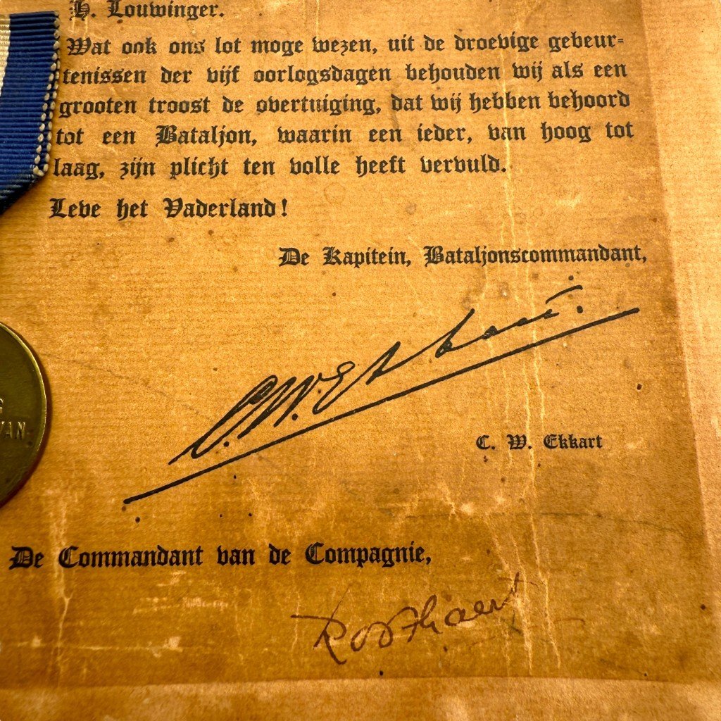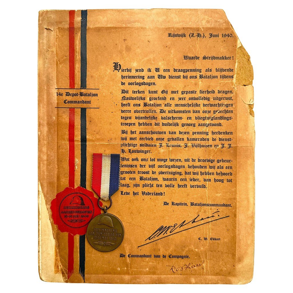 This is an original Dutch certificate with medal from June 1940.The certificate was awarded to a soldier of the 14th Depot Battalion as a remembrance of the May Days of 10โ14 May 1940.The accompanying bronze medal shows on the front a Dutch helmet with the text 'Herinnering aan den oorlog van 10โ14 mei 1940' ('In remembrance of the war of 10โ14 May 1940').On the reverse, the coats of arms of Zeeland and Bergen op Zoom are depicted, surrounded by the text '14e Depot Bataljon.'The certificate is provided with a red seal showing the same helmet and commemorative text.The text pays tribute to the fallen comrades and the courageous efforts of the battalion during the fighting.The certificate is signed by the battalion commander and the company commander.The set is in a used condition.An interesting collectible for a May 1940 or Dutch Army collection.Article number: 16789Originele WWII Nederlandse Herinnering aan den oorlog van 10โ14 mei 1940 medaille met oorkondeDit is een Nederlandse oorkonde met medaille uit juni 1940.De oorkonde werd uitgereikt aan een soldaat van het 14e Depot-Bataljon als herinnering aan de meidagen van 10โ14 mei 1940.De bijbehorende bronzen medaille toont op de voorzijde een Nederlandse helm met de tekst 'Herinnering aan den oorlog van 10โ14 mei 1940'.Op de keerzijde zijn de wapens van Zeeland en Bergen op Zoom afgebeeld, met daaromheen de tekst '14e Depot Bataljon'.De oorkonde is voorzien van een rood zegel met dezelfde afbeelding van de helm en de herdenkingstekst.In de tekst wordt hulde gebracht aan de gevallen kameraden en de moedige inzet van het bataljon tijdens de gevechten.De oorkonde is ondertekend door de bataljonscommandant en de compagniescommandant.De set verkeert in een gebruikte conditie.Een interessant verzamelobject voor mei 1940 of Nederlands leger collectie!
