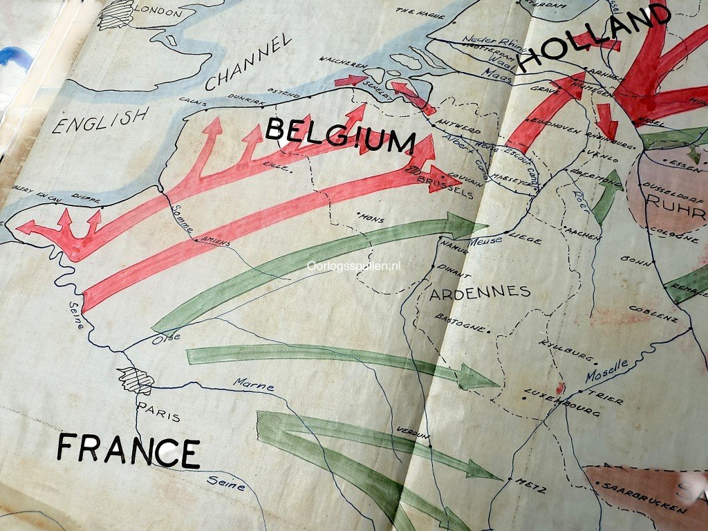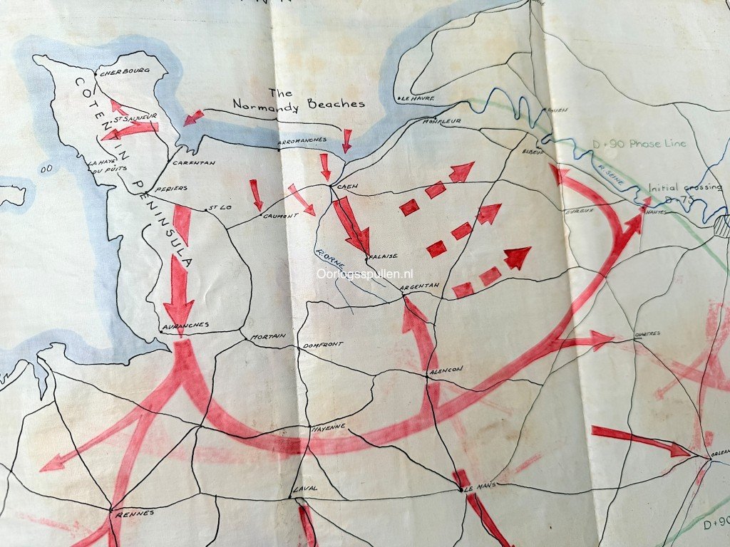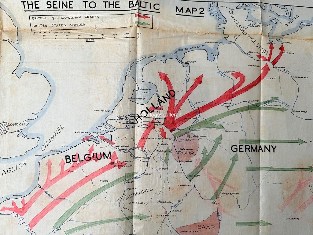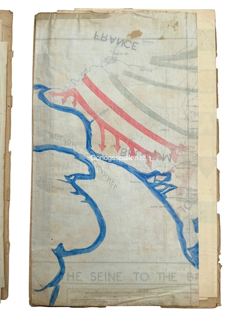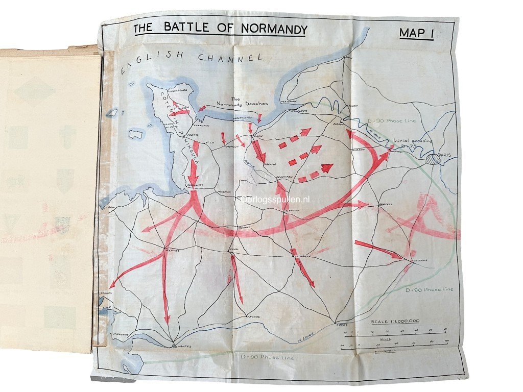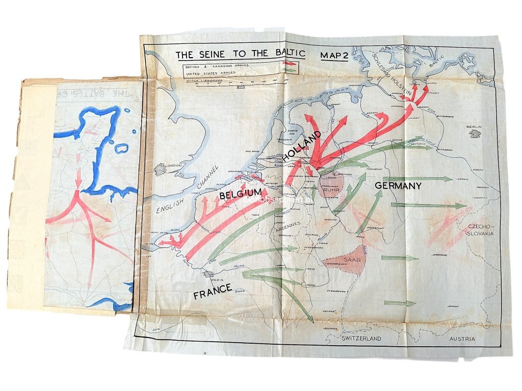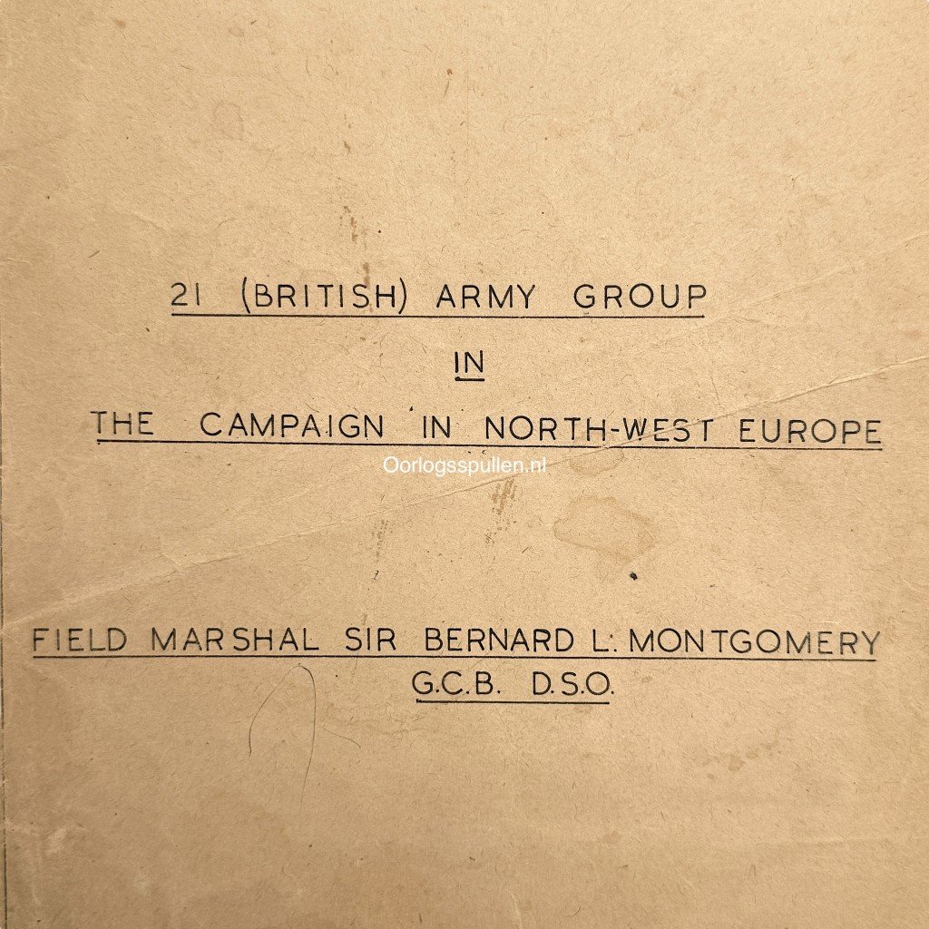 21 (British) Army Group in the Campaign in North-West Europe 1944β1945 is a rare and authentic military report, written by Field Marshal Sir Bernard L. Montgomery himself.It was presented in October 1945 at the Royal United Service Institution in London and provides an account of the Allied campaign from D-Day to the German capitulation.The document contains a detailed text with Montgomery's own analysis of the key battles and strategic decisions: the Normandy landings, the breakout at Caen, the Battle of the Ardennes, the fighting in the Rhineland, and the advance to the Elbe and the Baltic.What makes this report particularly special is that it is complete with several fold-out maps, including:The Battle of Normandy (Map 1) β showing the invasion beaches and the advance through France.The Seine to the Baltic (Map 2) β illustrating the Allied movements through the Netherlands and into Germany.An overview of Formation Signs (May 1945) with the division and army insignia of British, Canadian, and other Allied units.A historical piece of Allied military history, documenting the decisive battles and strategic choices of the liberation campaign in North-West Europe, authored by one of the most renowned British commanders of the Second World War!Article number: 16799Originele 1945 Britse militair rapport afkomstig van Field Marshal Sir Bernard L. Montgomery21 (British) Army Group in the Campaign in North-West Europe 1944β1945 is een zeldzaam en authentiek militair rapport, opgesteld door Field Marshal Sir Bernard L. Montgomery zelf.Het werd in oktober 1945 gepresenteerd aan de Royal United Service Institution te Londen en biedt een verslag van de geallieerde veldtocht van D-Day tot aan de Duitse capitulatie.Het document omvat een uitgebreide tekst met Montgomery's eigen analyse van de belangrijkste veldslagen en strategische beslissingen: de landing in NormandiΓ«, de doorbraak bij Caen, de Slag om de Ardennen, de strijd in het Rijnland en de opmars naar de Elbe en de Baltische Zee.Bijzonder is dat dit exemplaar compleet is met meerdere uitvouwbare kaarten, waaronder:The Battle of Normandy (Map 1) β met de invasiestranden en de opmars door Frankrijk.The Seine to the Baltic (Map 2) β met de geallieerde bewegingen richting Nederland en Duitsland.Een overzicht van Formation Signs (mei 1945) met de divisie- en legeremblemen van de Britse, Canadese en geallieerde eenheden.Een historisch stuk geallieerde militaire geschiedenis, dat de beslissende gevechten en strategische keuzes van de bevrijdingscampagne in Noordwest-Europa op unieke wijze documenteert en afkomstig is van één van de bekendste Britse bevelhebbers uit de Tweede Wereldoorlog!
