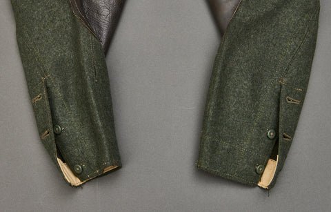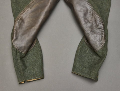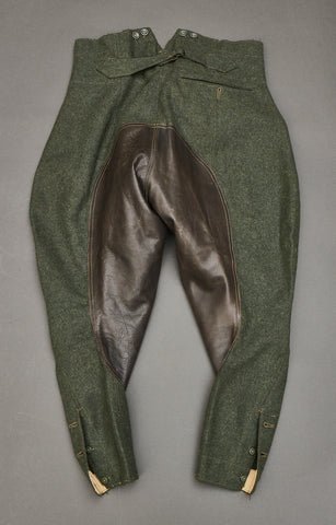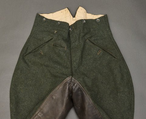 WWII German Army Riding Breeches-These are produced in field grey wool with a large grey leather patch inside the legs and around the rump. There is minor wear and minor discoloration only. The lower legs have buttoned closures. There are buttoned hip pockets, a single rear pocket and a watch pocket. There is a four button fly with an additional button at the waist. There are buttons for suspenders and a cinch strap at the rear. The interior has ink stamps that indicate the maker was Steinmeyer. There are size stamps as well as the date '43. The waist is a size 34 and these are 38' in length. Overall great condition!