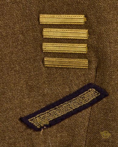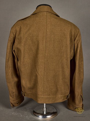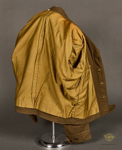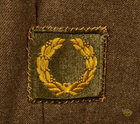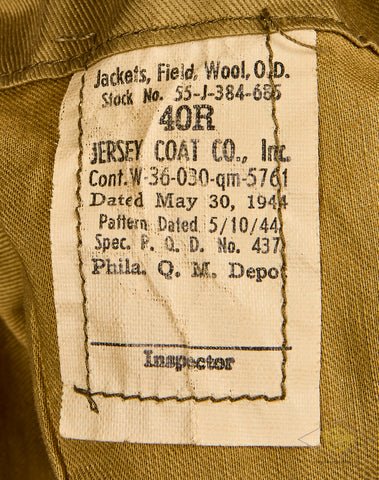 WWII US Dual Unit Ike Jacket for a Tech Sergeant-This dual unit example is in fine condition overall. It is produced in a greenish shade of olive drab. It has a four button closure and all buttons are brown bakelite. There are pleated breast pockets with scalloped flaps. The left sleeve has a tech sergeant chevron that is applied in a beautiful zig zag type stitch. There is also a unit patch for the 3rdArmy, complete with metal 'ball' piping which makes it really stand out. The left sleeve also has four METAL stripe devices for 2 years of overseas service and a slash for the Combat Infantryman Badge. The right sleeve has a 5thArmy Corps sleeve patch (with the same metal ball piping) plus another rank chevron applied in the same manner as the one on the left. There is also a Meritorious Unit Citation patch. There is a 'Ruptured Duck' patch above the right breast pocket. The left collar disc is for signals corps and the right is the standard US. The interior is fully lined in tan cotton. There is a pocket on each side. The right side has a tailor tag with the date May 30, 1944. The tailor is Jersey Coat Co., Inc. and the size is 40R. There is a size tag in the neck. Special!Please note that any 'accessories' (i.e. medals, badges, belts etc.) are NOT included unless stated in description!