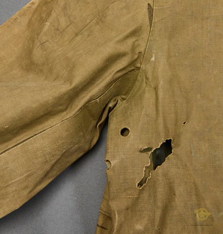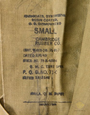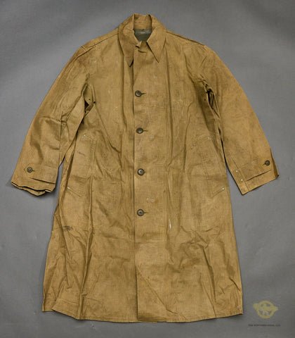 WWII US M1942 Raincoat-This is the o.d. synthetic resin coated raincoat used by US soldiers during WWII. This one is complete but has wear and a few holes. A staple and would be a great combat used display item!Please note that any 'accessories' (i.e. medals, badges, belts etc.) are NOT included unless stated in description!