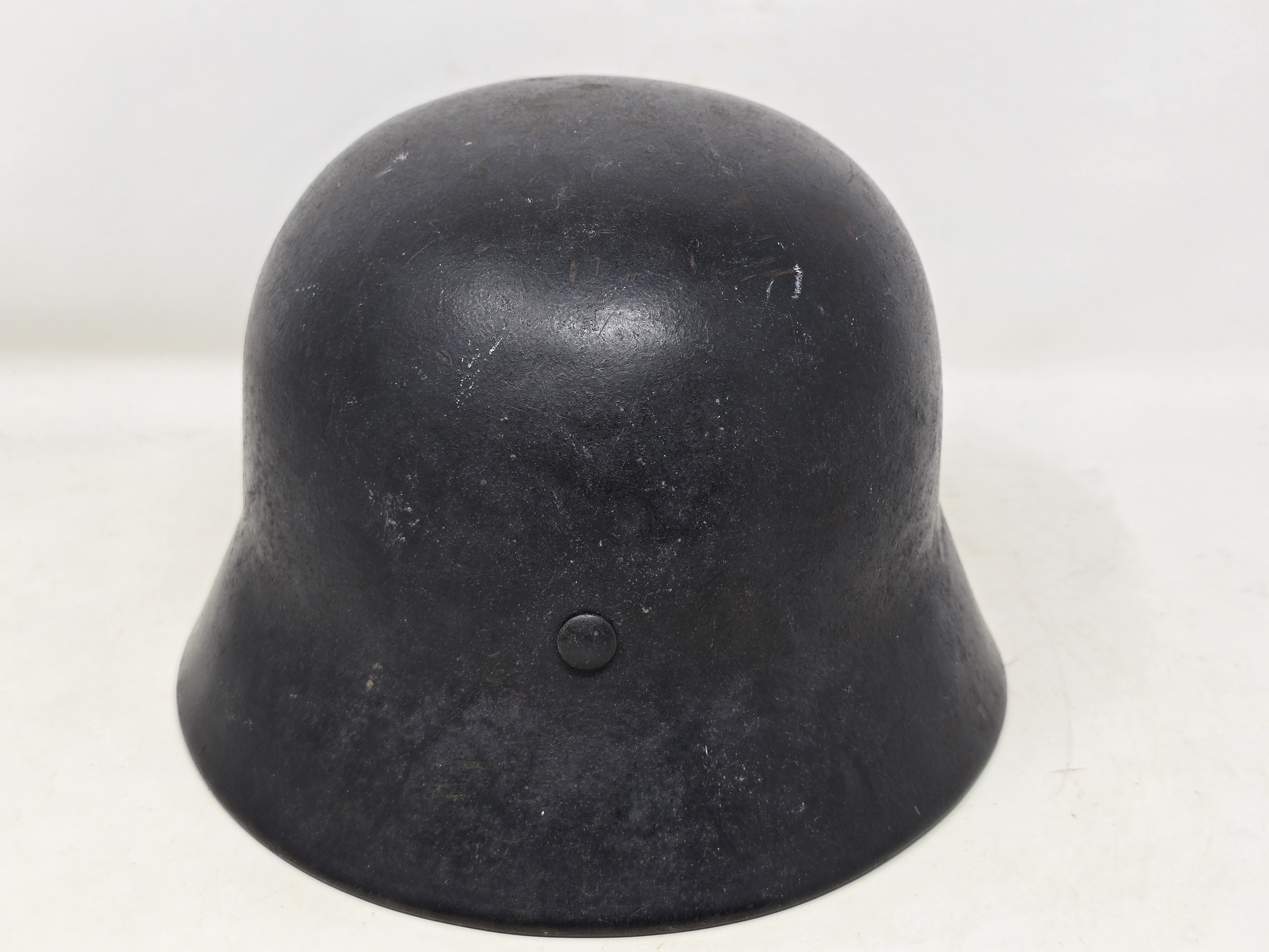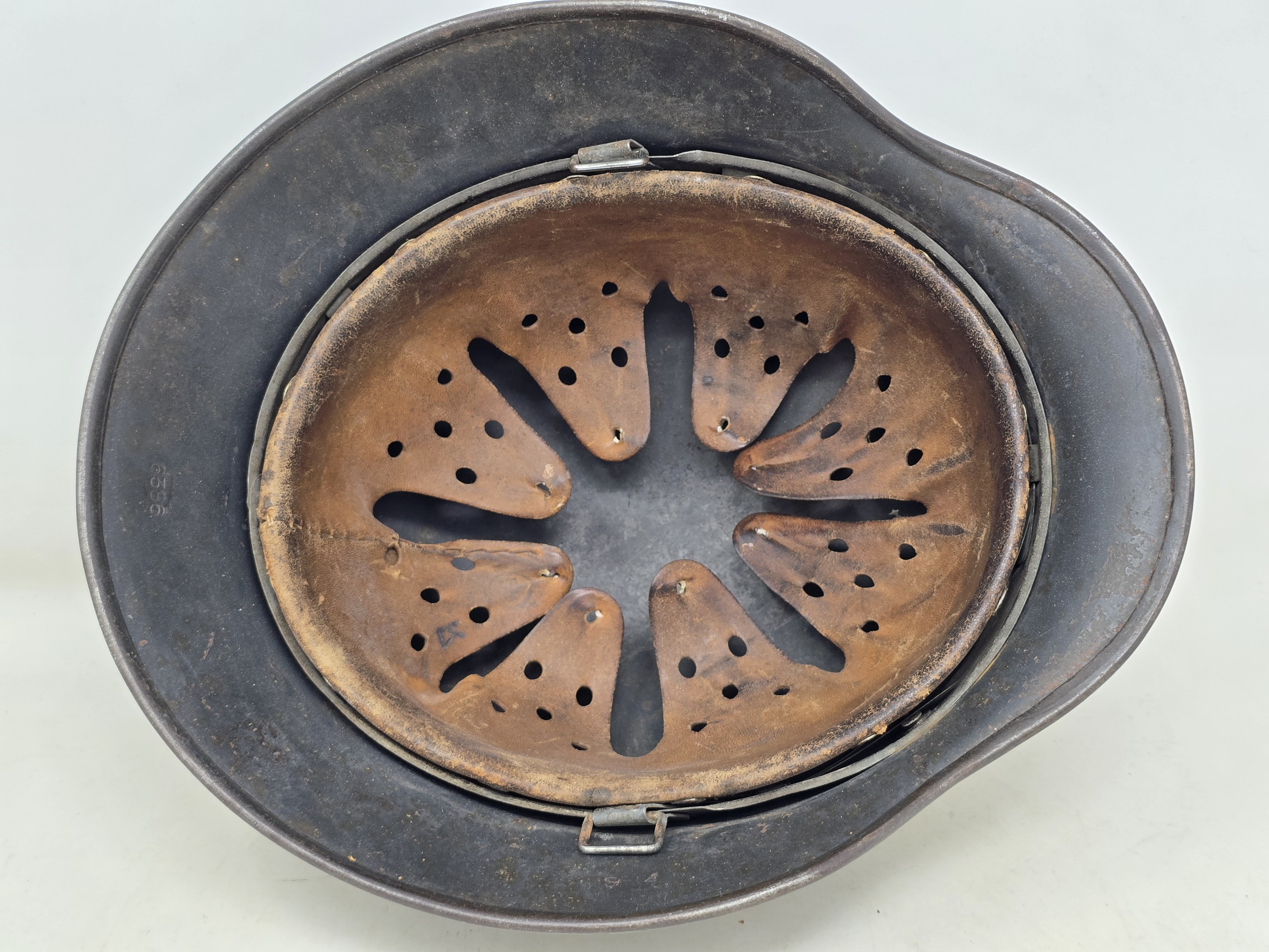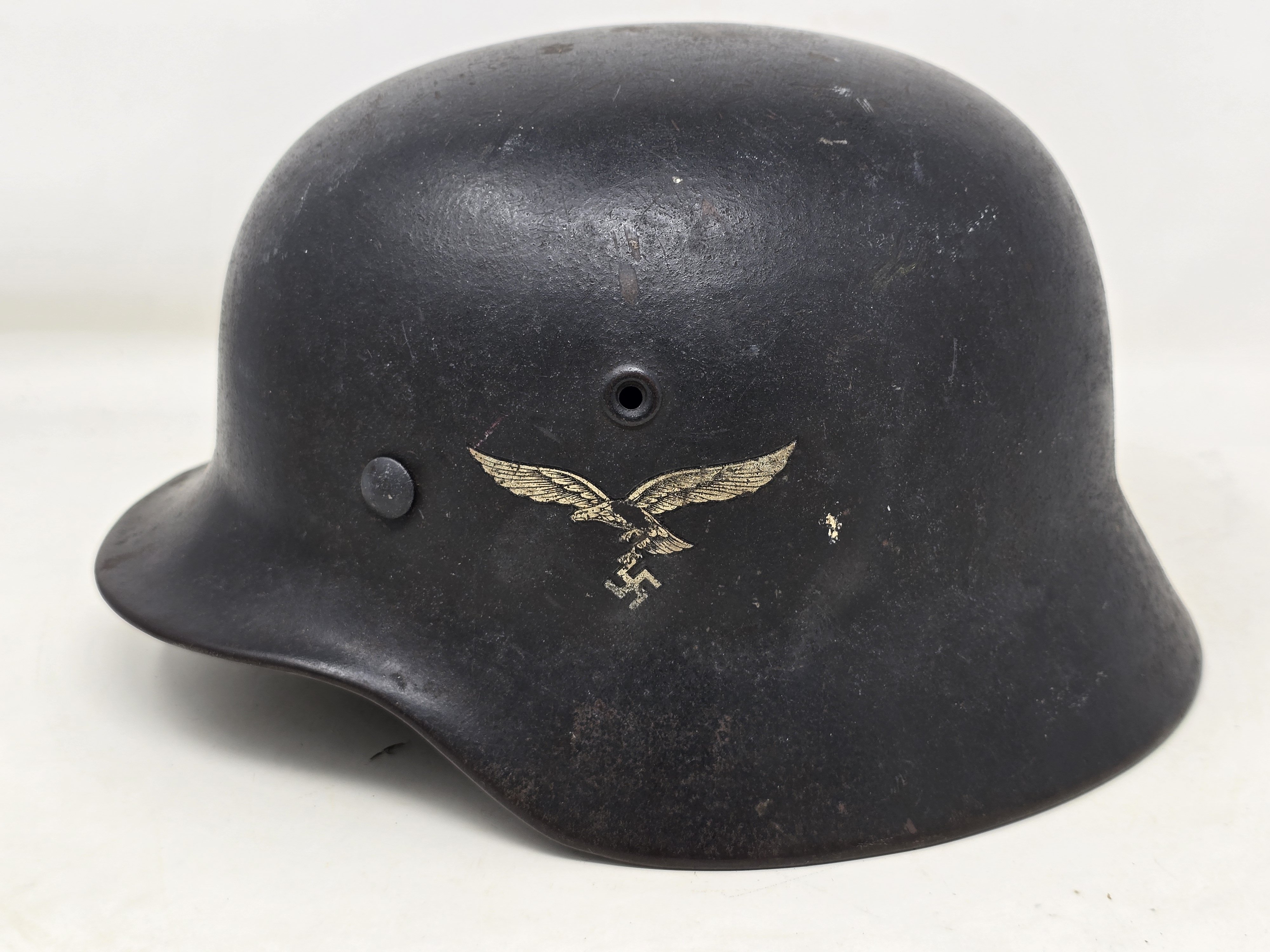 This is a nice condition LW M40, SE64 #6386, featuring nearly 100% finish and a strong Luftwaffe adler decal. The liner shows medium service use, and is devoid of its drawstring and chinstrap. Overall a nice example, COA accompanies.