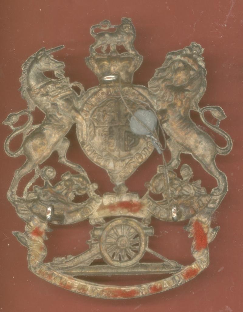 A fine scarce die-stamped silvered metal example worn circa 1878-1900. Royal Arms with scroll below inscribed '1st' over a gun resting on a scroll inscribed 'Argyll & Bute Artillery Vols'. Three loops to reverse. VGC
