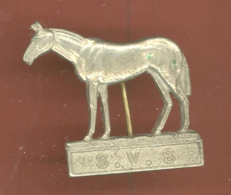 A fine ultra scarce die stamped white metal example. Standing horse over 'S.V.S.' tablet. Pagri pin to the reverse. VGC.