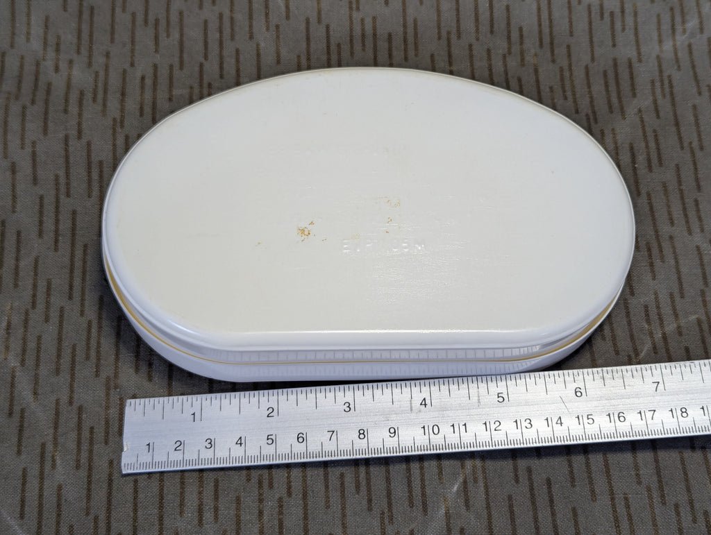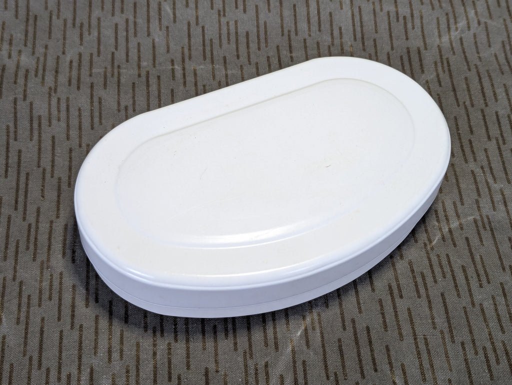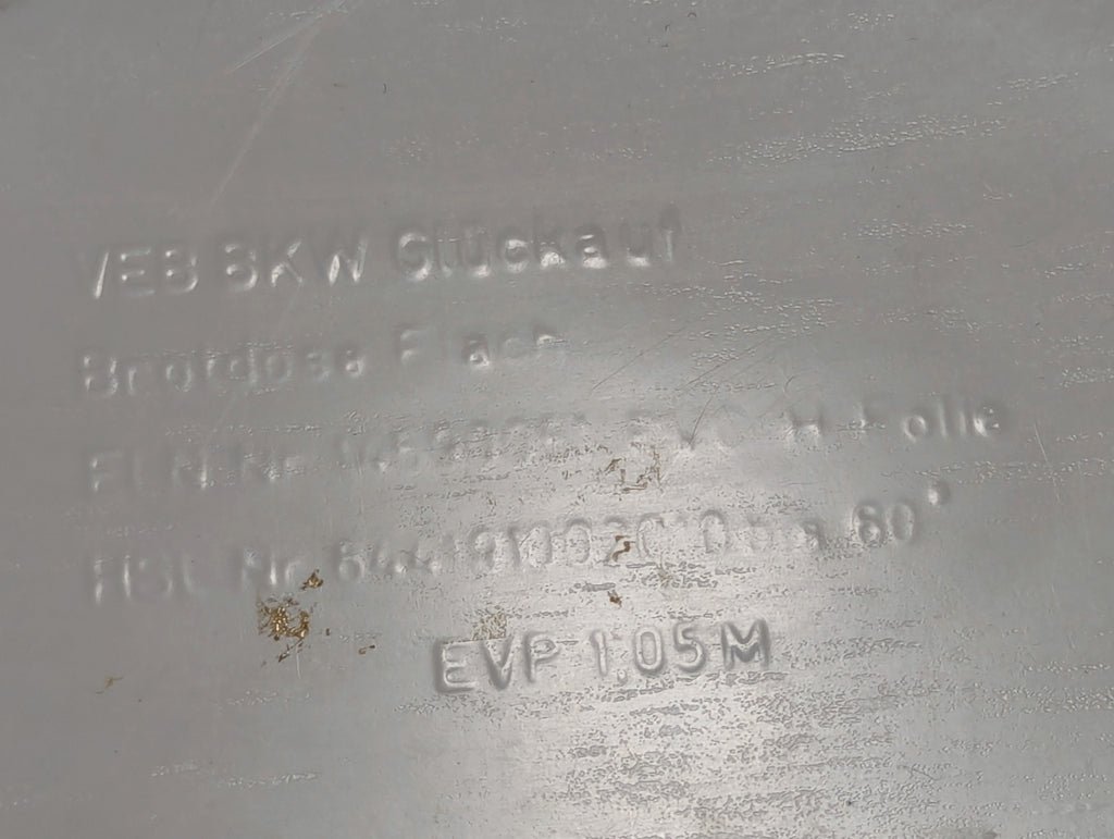 East German white plastic bread container. Much like the WWII era ones, but made from very thin, flexible plastic. The bottom has a brand name VEB GlΓΌck Auf on it along with some numbers the fixed price EVP. 1.05 M (I guess they never anticipated a collectors market). It has some light wear.More East German items here.