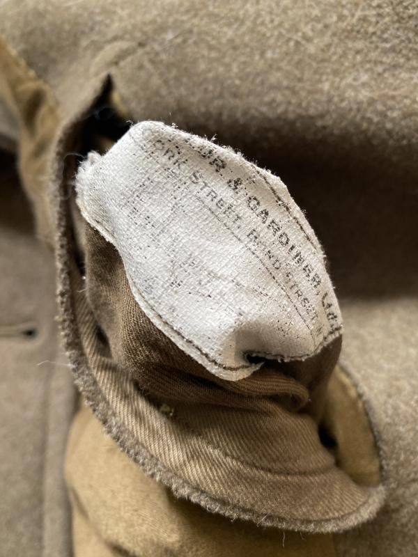 This is a nice WW2 British Officer's Great Coat, this one is dated 1941 with its original label on the inside pocket which has the makers Taylor & Gardiner Ltd, also named but its hard to make the name out but looks like it belonged to a Lieutenant, some of the Brass buttons has some oxidation to it, and some of the stitching under the inside collar has come away, otherwise its in very good condition, Approx. size 36' chest and 20' under the arm.Check out our YouTube channel below.https://m.youtube.com/results?sp=mAEA&search_query=chase+militaria+