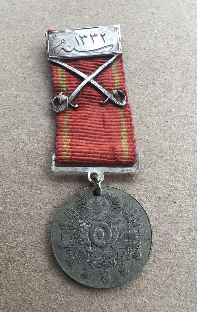 A rare wartime example. During World War I a clasp of two crossed swords was attached to the ribbon with the date AH 1333 (1915) inscribed upon them.Original medal. Small size 25mm diameter.