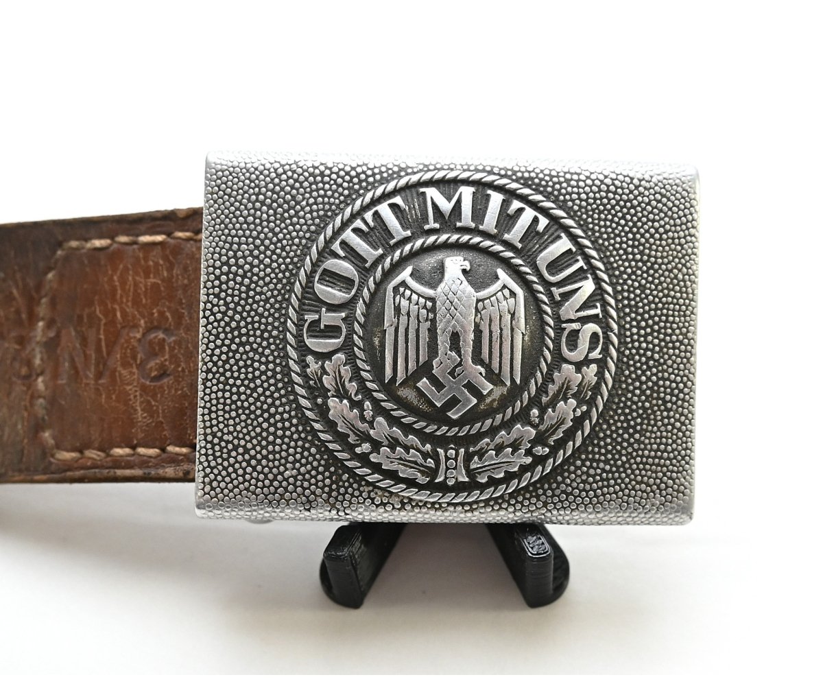 Very nice aluminium Wehrmacht belt buckle with leather tab in used, but very good condition.