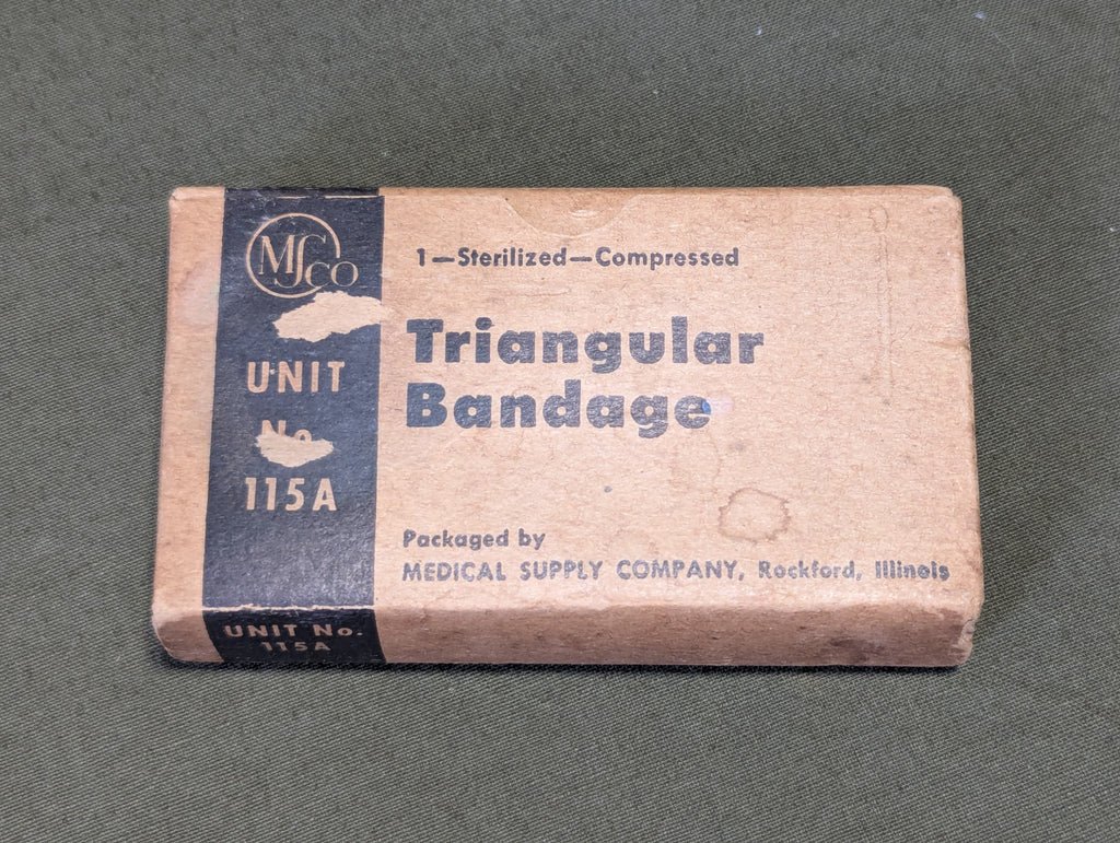 Original US triangular bandage in box. The bandage is still wrapped up in paper inside. The box has some wear and small water stains. I did not take the bandage out.