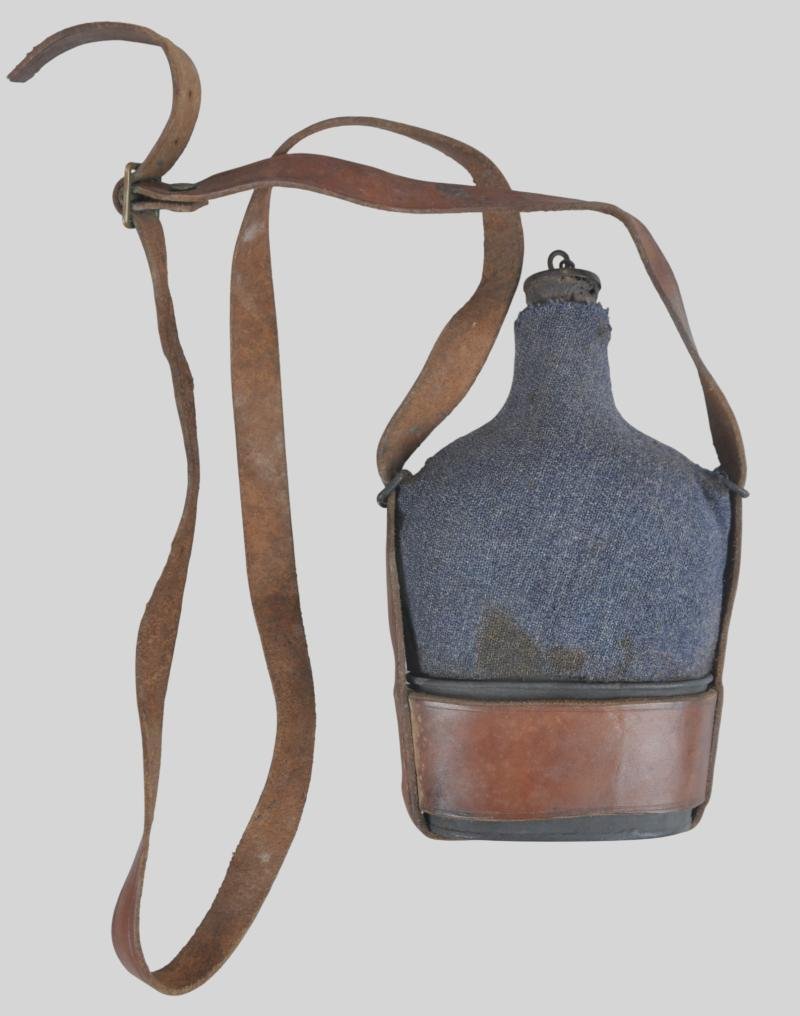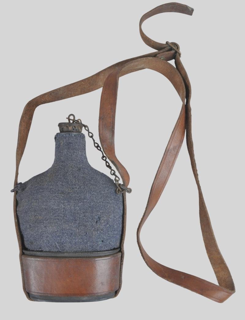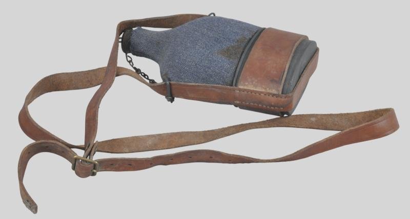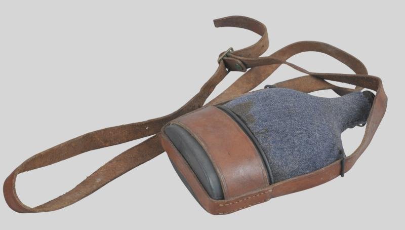 A 1 Litre French waterbottle carried as part of the officers field equipment this piece dating from 1915 with horison blue cloth as per the M1915 uniform issue.Leather carrying strap intact.