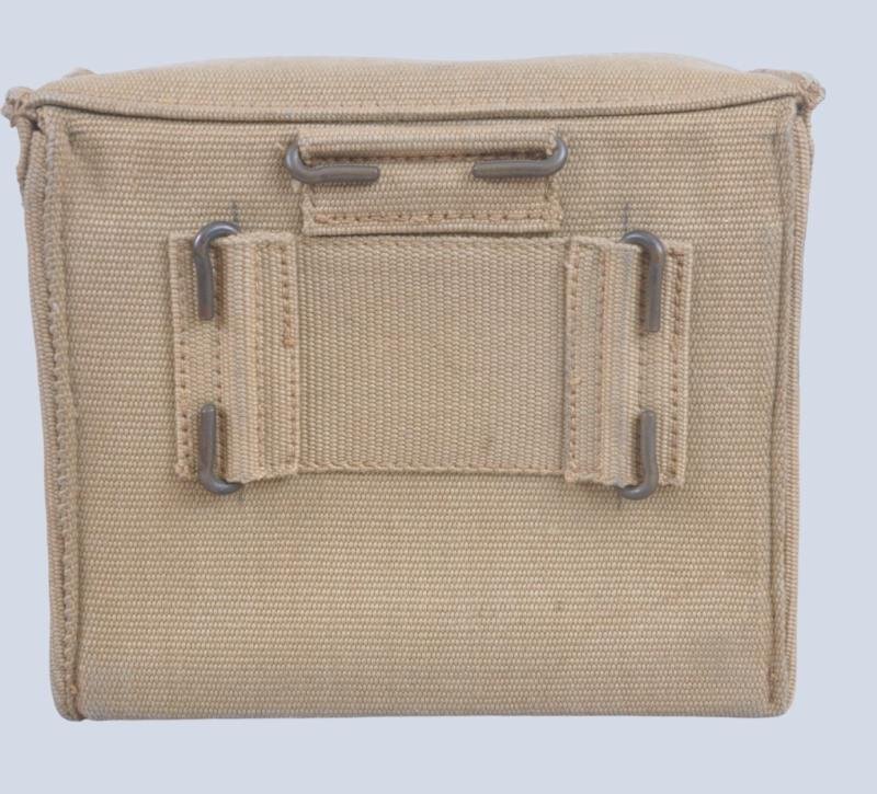 Early issue of the British '37 pattern webbing binocular case dated 1938.These first issues were made without side buckles , which were seen later. Marked to underside of lid 'MECo1938' .