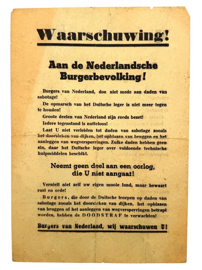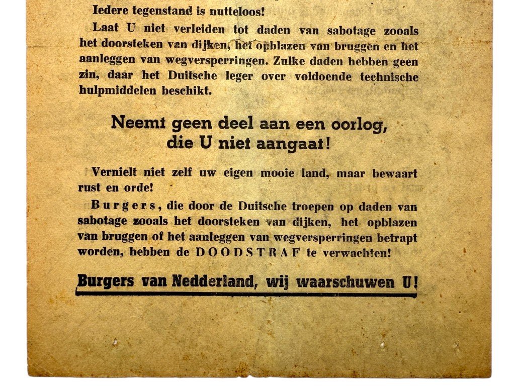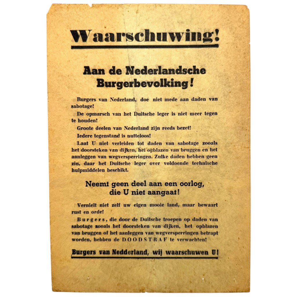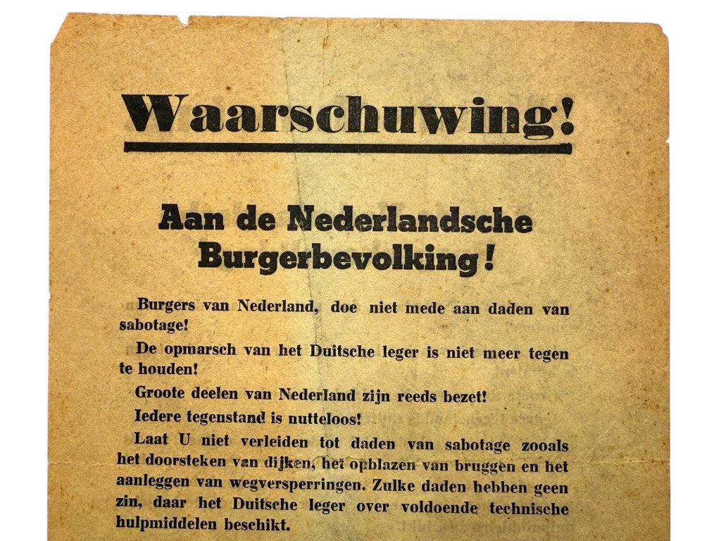 This propaganda flyer, distributed by the German occupying forces in May 1940, dates from the early phase of the Second World War in the Netherlands.With the striking headline 'Warning! To the Dutch Civilian Population!' the German occupier attempted to intimidate Dutch citizens and discourage them from engaging in resistance or sabotage actions, such as blowing up bridges or breaching dikes during the German invasion of the Netherlands.The flyer emphasizes that saboteurs could expect the death penalty.The message was clearly intended to spread fear and enforce compliance, while parts of the Netherlands were already occupied by German troops.An interesting item for any May 1940 or Second World War collection!Article number: 16801