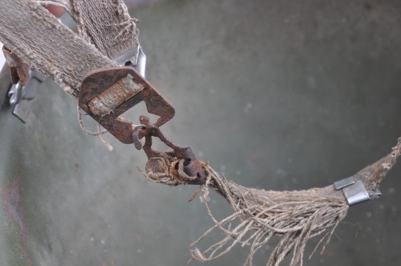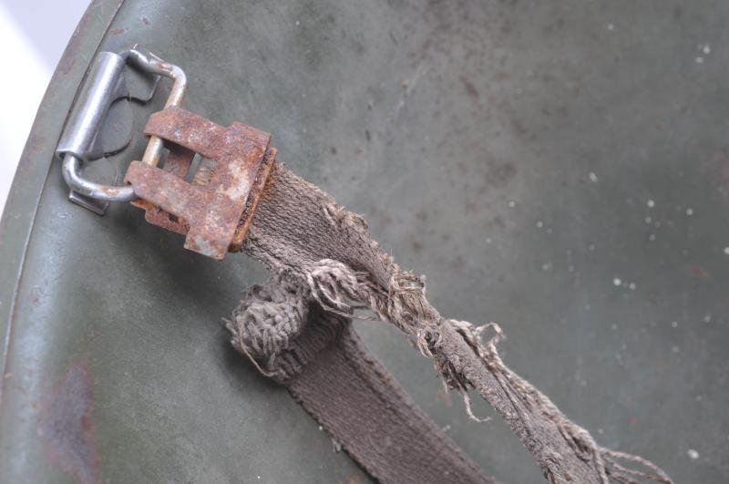 A 1982 Falklands war Argentinian issued helmet that has a bullet or shrapnel penetration having gone through its right lip.This helmet is a classic US made shell from the Korean war / Vietnam war era deemed surplus by the US Government & supplied to Argentina much before the conflict. These were typically reconditioned by Argentina as is the case here with a distinctive Argentinian dark rough textured green repaint applied to its exterior & Argentinian made chinstraps & fittings to inner. Having come back from the Falklands conflict the liner was most likely left behind perhaps as a result of wounds received via the impact hole.