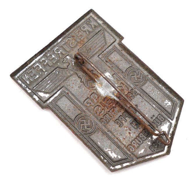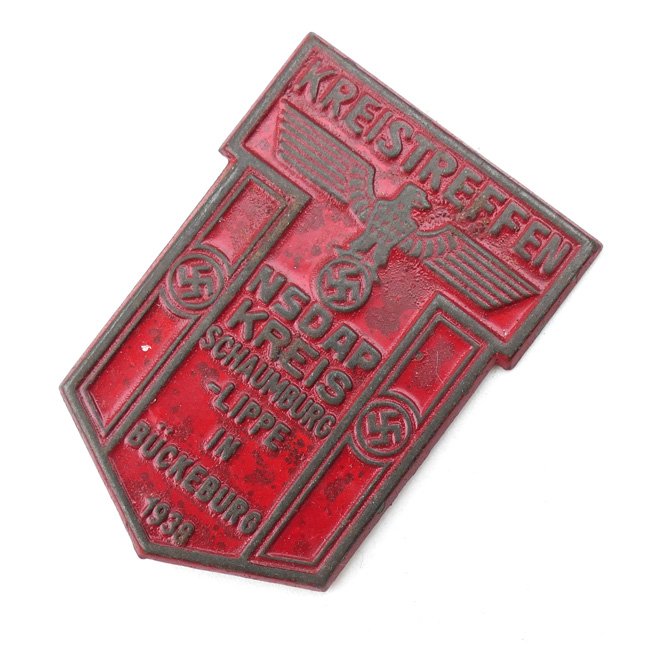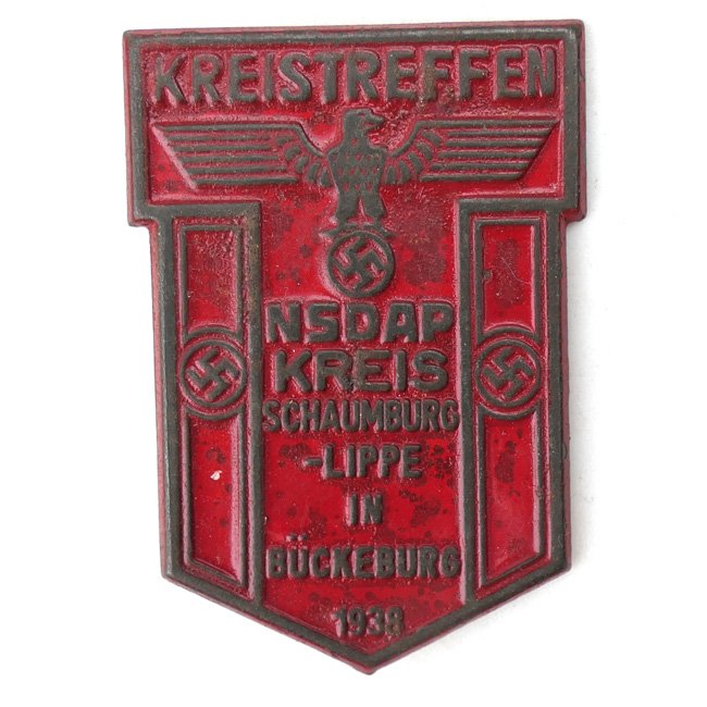 'Kreistreffen NSDAP Kreis Schaumburg-Lippe in BΓΌckeburg' 1938 Tinnie (Veranstaltungsabzeichen). The tinnie has a pin-back device to its hollow-back reverse. The tinnie is not visible maker marked. The tinnie is very lightweight, stamped from a thin metal sheet. Rare original NSDAP tinnie!