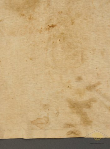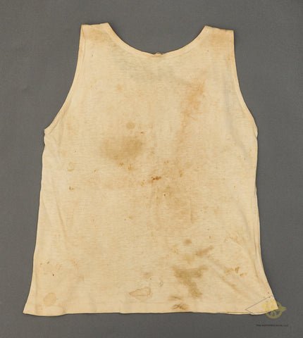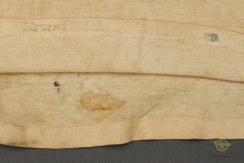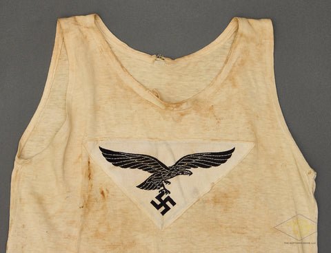 WWII German Luftwaffe Athletic Shirt-This is produced in white linen that is discolored and stained with minor wear from use. There are a few small holes as well. The triangular patch on the front features a black machine woven Luftwaffe eagle. There is a name ink stamped into the hem, I can read 'Ernst' but there is more. This is a size medium. Good but salty overall condition!