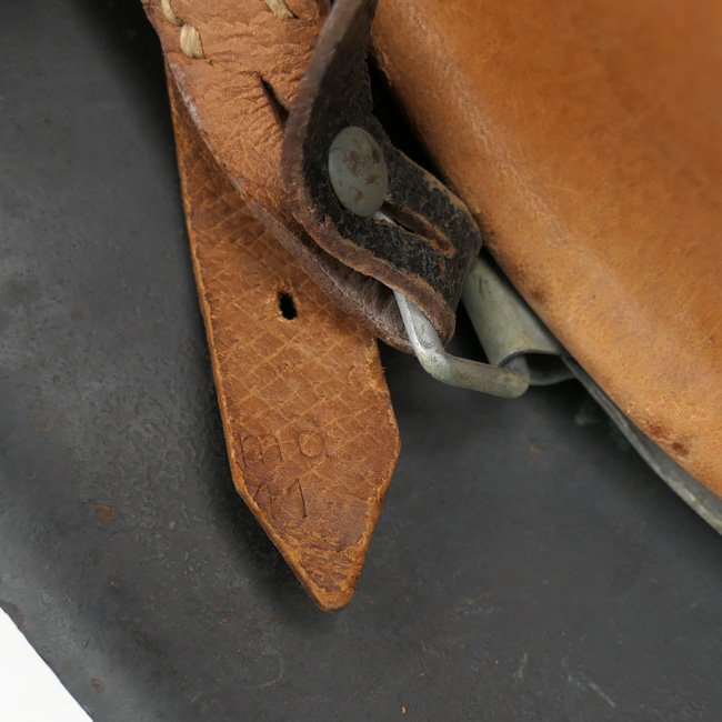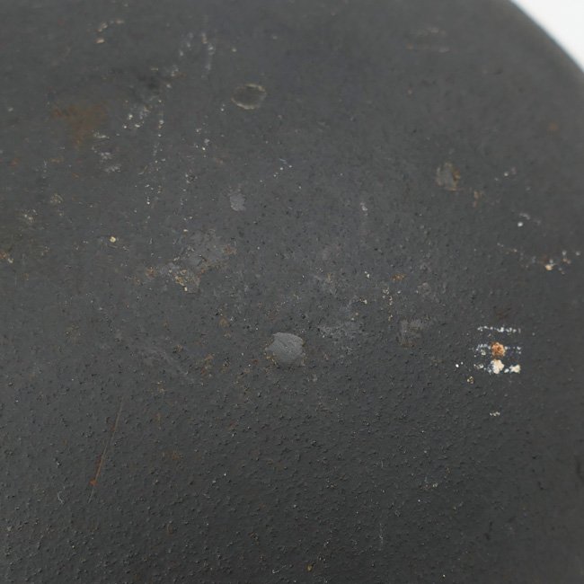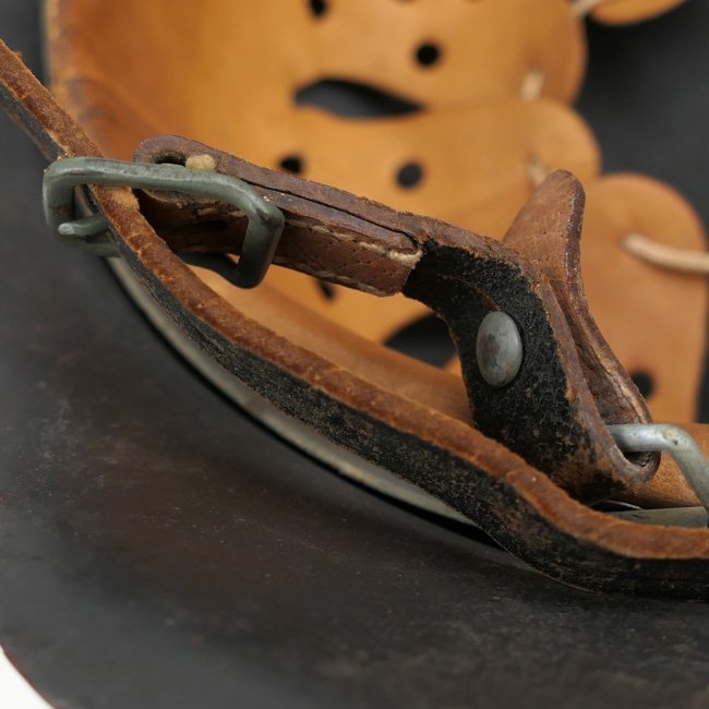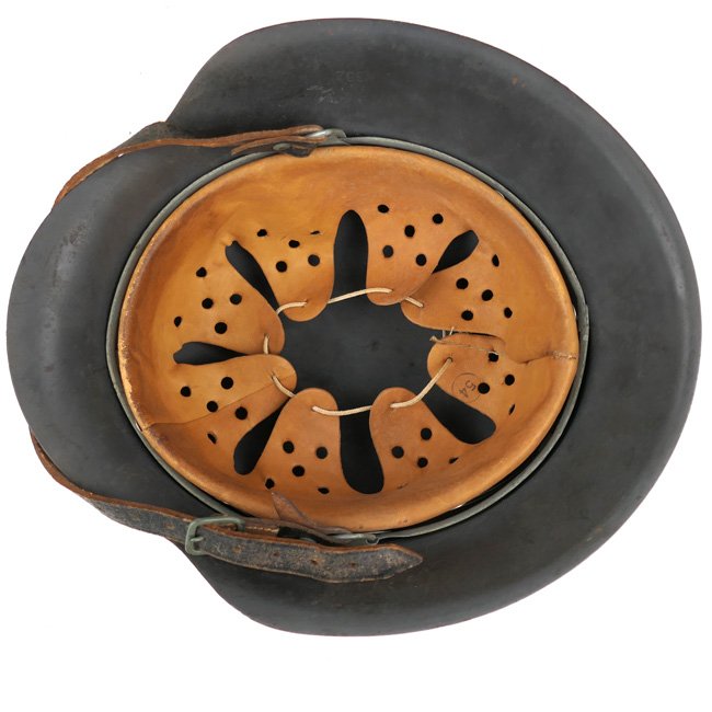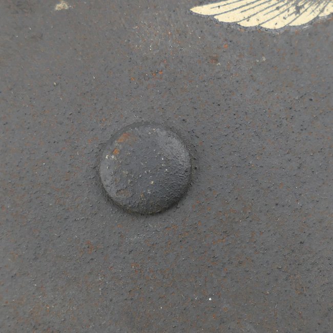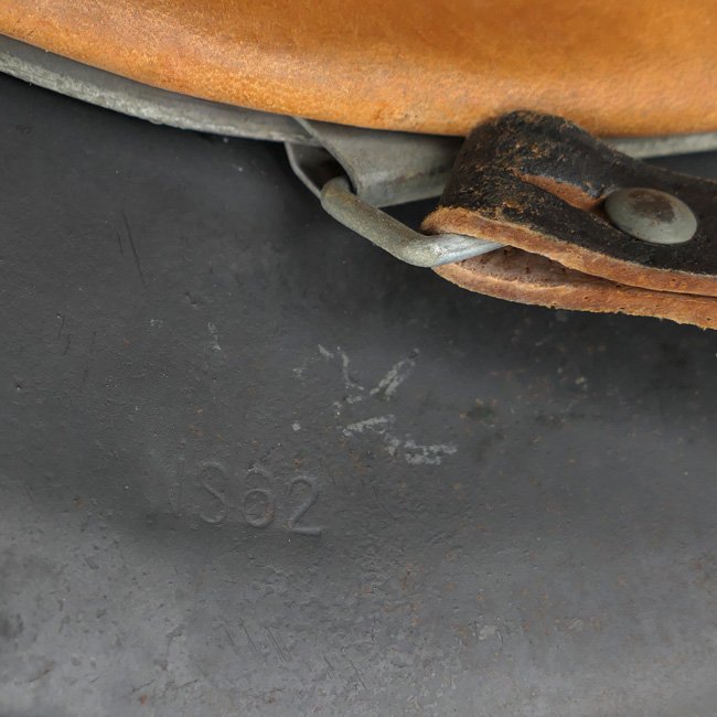 Luftwaffe Single Decal M42 Combat Helmet (Stahlhelm M42). The steel construction M42 helmet retains almost all of its rough textured,blue-gray paint and about 98% of the decal.The paint shows normal wear and scratches caused by usage andthe helmet shows some light surface rust and dirt and is in uncleaned condition as found. All three liner retaining rivets are intact. The interior of the helmet is a M31 leather liner with all eight fingers intact, the liner is size '54' marked. The liner is complete with its original drawstring. The shell is marked with maker and size 'NS62' which indicates production by the company 'Vereinigte Deutsche Nickelwerke AG' from Schwerte. The reverse interior neck guard apron has a stamped serial number 'D276'. There is a nice dome-stamp inside the helmet shell. The helmet is complete with its original chinstrap, the chinstrap is nicely maker marked and dated 1941. Nice original late war Luftwaffe helmet in very good, near mint and unissued, condition!