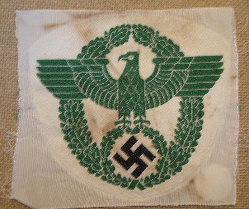 WW2 German Police Sports Vest Breast Eagle, which depicts an eagle and swastika superimposed upon an oval wreath of oak leaves machine embroidered in green thread on white background with a black swastika in good condition.Wing tip to tip 3 3/4''