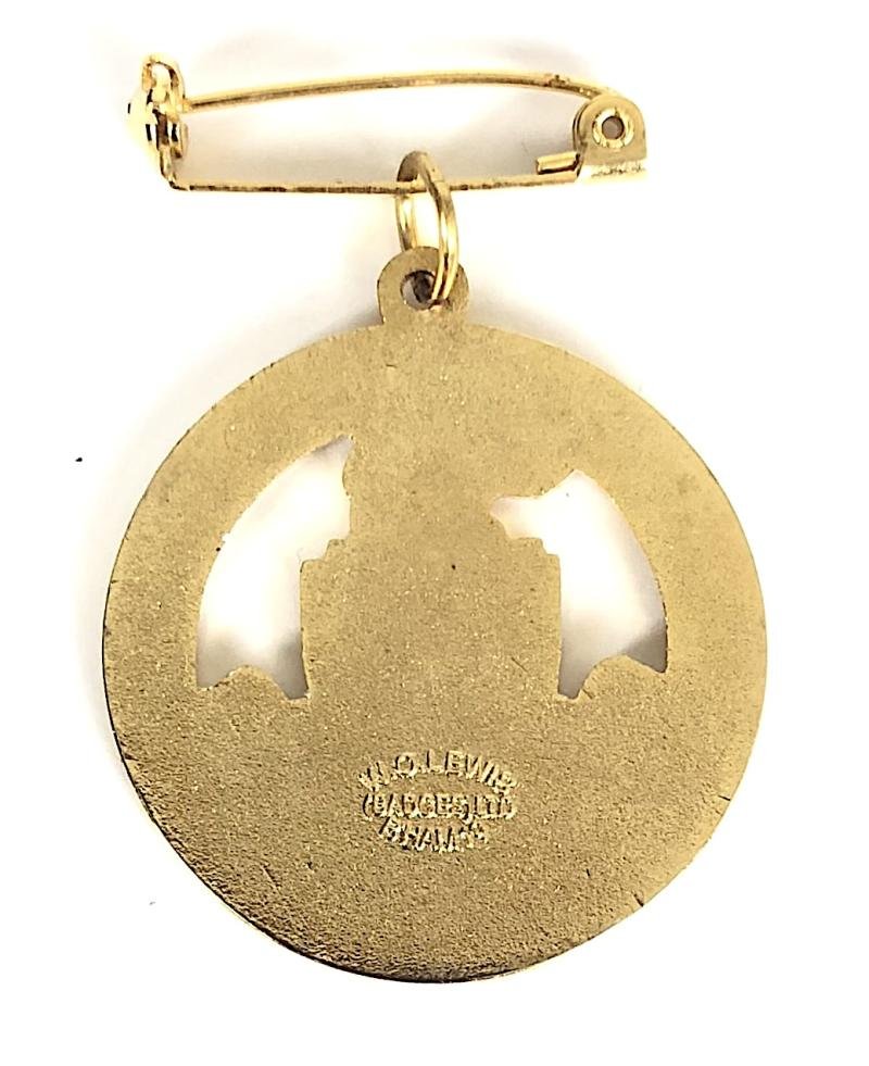 A good original '2007 Leander Rowing Club gilt and enamel badge' depicting a 'Hippopotamus' over a Star and Arrow shield with 'Corpus Leandri spes mea' motto below; the reverse with maker's details 'W.O.Lewis (Badges) Ltd B'Ham.19. Very good condition, enamel perfect and complete with original pin fitting with safety roller catch in good working order.Diameter approx 34mm.
