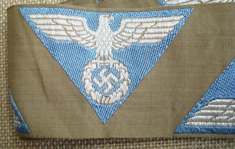 SA-related cap-eagle as was intended for the: 'Lagermütze' (ie. side-cap) being an example as woven on a typical bright-blue-coloured background and as such intended for members within the: 'SA-Gruppe Warthe o. Oberrhein' I have 10 , this is for one.