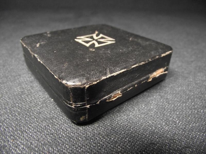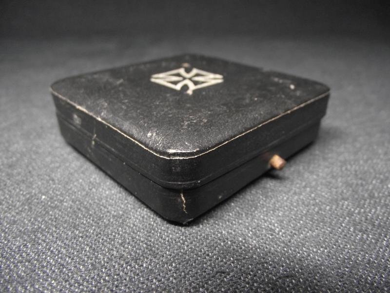 Nice condition set with the 65 marked cross having a tight two piece frame with dark areas from patina. The central iron core has close to 100% of its black factory finish, minor areas of wear to the swastika only. The rear has its period hardware, catch, hinge and pin associated with crosses manufactured by the K&Q firm including its code number stamp 65. The box again in very nice condition with little wear to the outside and strong Iron cross motif to the top. Both hinge and front opening button working fine. The inside is clean with the cloth hinge split.