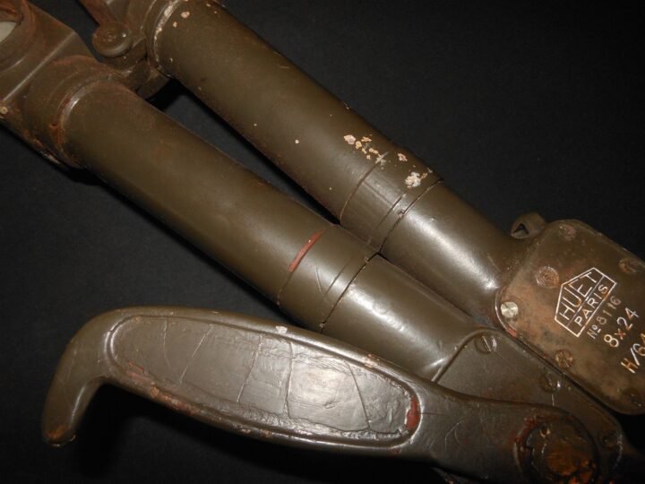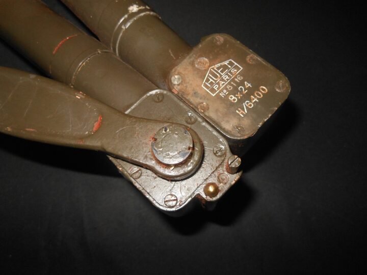 You are bidding on a VERY NICE used example of WW2 Greman Wehrmacht 8ร24 Handwinkelfernrohr (f) Sighting Periscope, as used by various ground personnel, tank destroyers, and Sd.kfz. 251 Half Tracks!Made in WW2 in captured French Factories, this Sighting Periscope wasa useful tool in the Wehrmacht for general observation (in both vehicles and on the ground), and for artillery fire observation and direction throughout the war.It was often seen poking out a commander's cupola, primarily as a safe method for him to observe the enemy without risk to life.Made of aluminum, brass, and steel by Huet,this aiming periscope is in EXCELLENT used condition. Manufactured by the Germans at the captured French factory, most of the original paint remains, with only slight wear and marks due o the age! Features the German 'H/6400' marking, indicating that it features a gradient scale. The optics are functional, however there is some spotting and a bit of haziness. All focus adjustment still turn as they should. Manufacture info and markings are stamped into the tubes. There is a chip in one of the objective lenses, but it does not affect the function. The case included is the original to the set, but sadly the bottom has worn away (see photos). It could be repaired, if one wished. I have shown this EXACT type in use in the Sd.Kfz. 251 Half Track in the last photos.A PERFECT addition to any collection or display!
