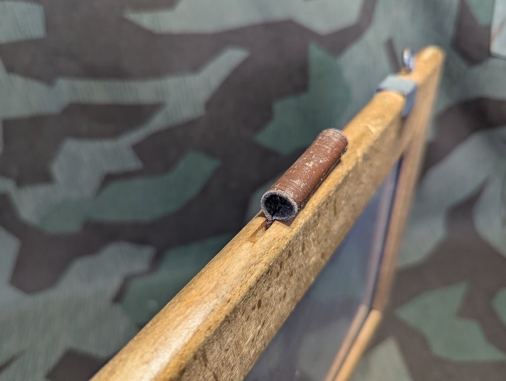 Period German map board. Typically used for artillery plotting or by officers. It is a nice wooden frame with an aluminum plate and a sheet of clear plastic to allow you to put in a map and use a grease pencil to your hearts content. This one has a leather loop for a writing implement and 2 eyelets for a leather carrying strap. This one also has a sheet of paper for 'winkelmessung' which appears to be more modern.These are interesting. I have found one or two that I know were Wehrmacht used, I have also found similar ones that were postwar and used to hold menus at restaurants and I know there is a slightly more modern version still used by archeologists. The layout of this one is like that of the military marked ones I have found, and the materials and age seem like it very well could be an actual WWII era one but I can't say for sure. One corner seems to have some glue in the joint which is a little loose, so I am guessing it was repaired.