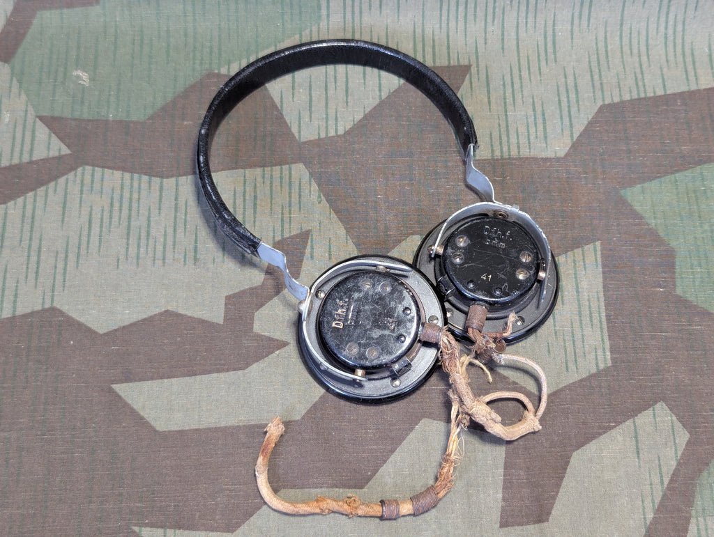 Original Wehrmacht Dfh.f. headset usually used with the various field radios. Marked bmm 41. This one is missing the cord and the springs for the cord are rusty and broken. An ideal set to repair, as the head band and ear pieces are actually fairly nice, so you could install new speakers and re-cord them. This is an actual military headset, not a civilian pattern. I did not test them because it looks like they probably don't work and the wires are too far gone to even try without tearing into them.