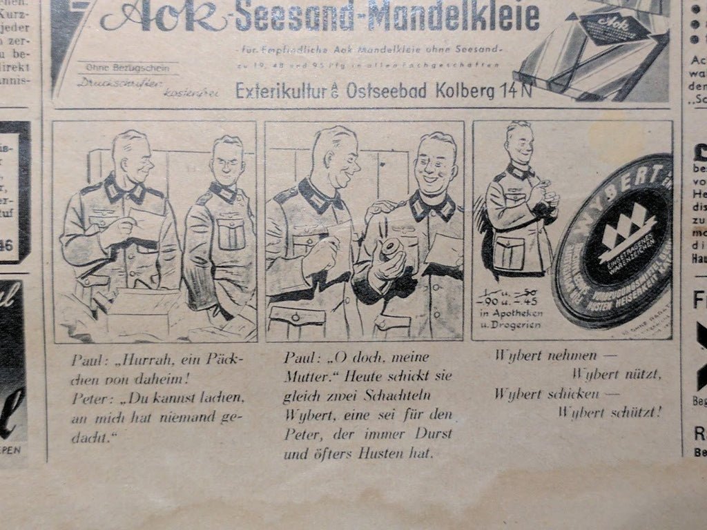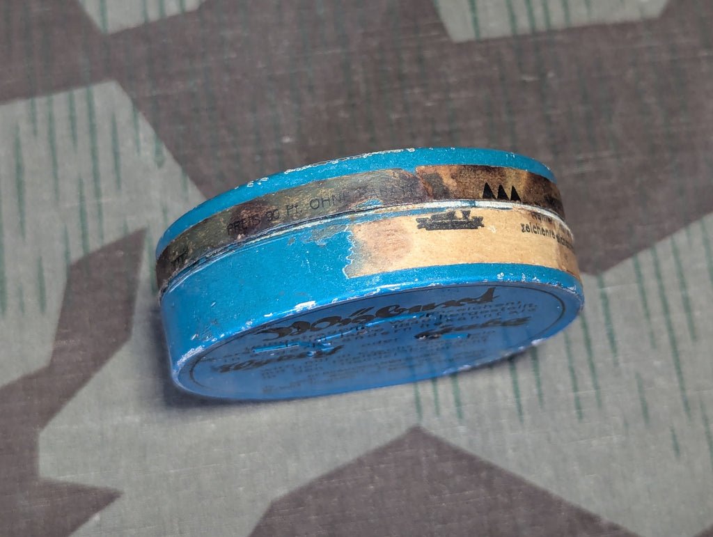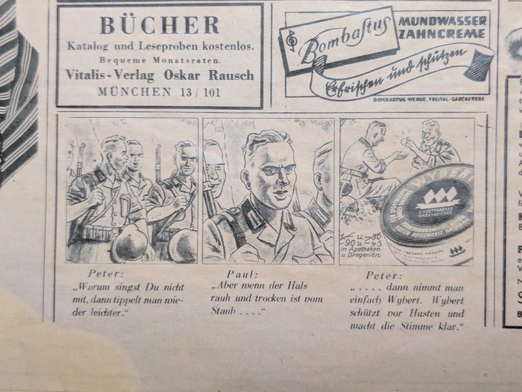 Original Wybert cough drop tin. Like many things at that time, it is advertised for many purposes: towards athletes, people with a cough or sinus issues, hoarseness, and even as a thirst quencher. They often had ads targeted towards Wehrmacht soldiers. It is in fairly good condition. The back of the tin has a raised image.The advertisements are from the November and December 1941 issues of Koralle magazine.