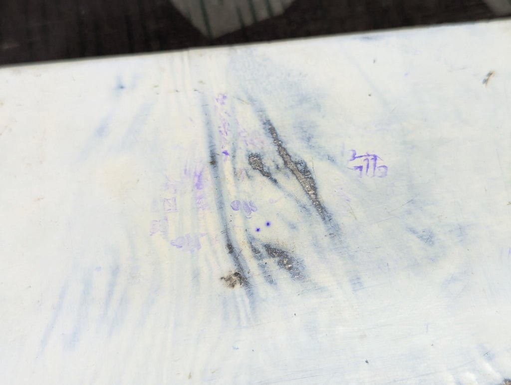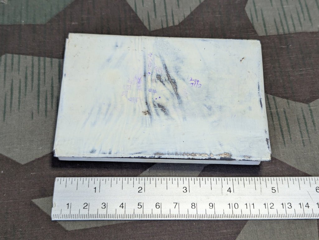 Period Bestes Dauerstempelkissen metal stamp pad. Purple colored ink pad is mostly dried up. Decent condition. It shows general wear and age.
