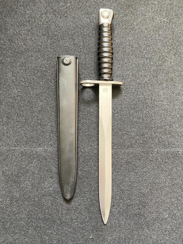 This is a Swiss SIG stgw MI957 Bayonet with Scabbard. This bayonet and scabbard are designed for use with the Swiss SIG stgw (Sturmgewehr) 57 assault Rifle, which was in production from 1957 to 1983. The bayonet features a ribbed plastic grip with a release catch guard. The blade is double-edged with a spear point and bears the makers mark. WF denoting the assembly by Waffenfabrik Bern. The serial number is W 517252. Age Restricted Item. Proof of age must be provided. U.K. Sales Only.Check out our YouTube channel below.https://m.youtube.com/results?sp=mAEA&search_query=chase+militaria+