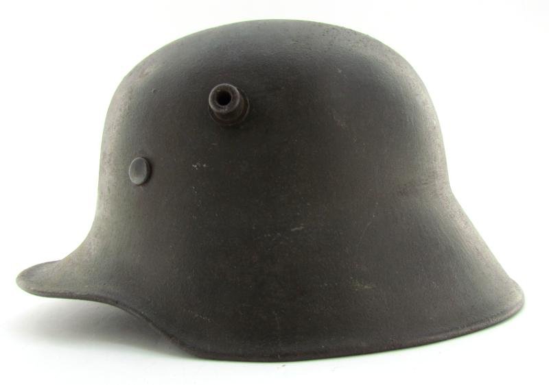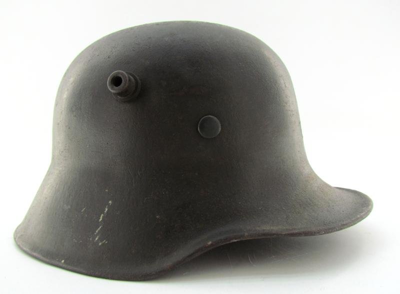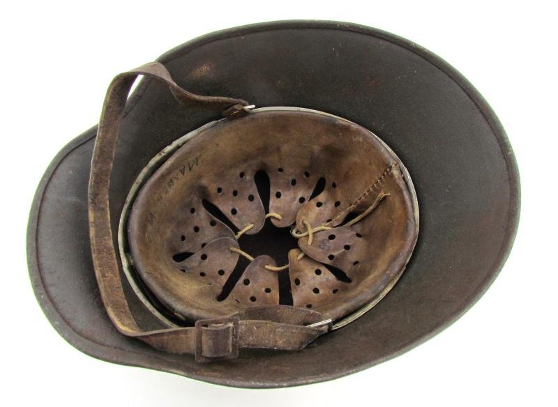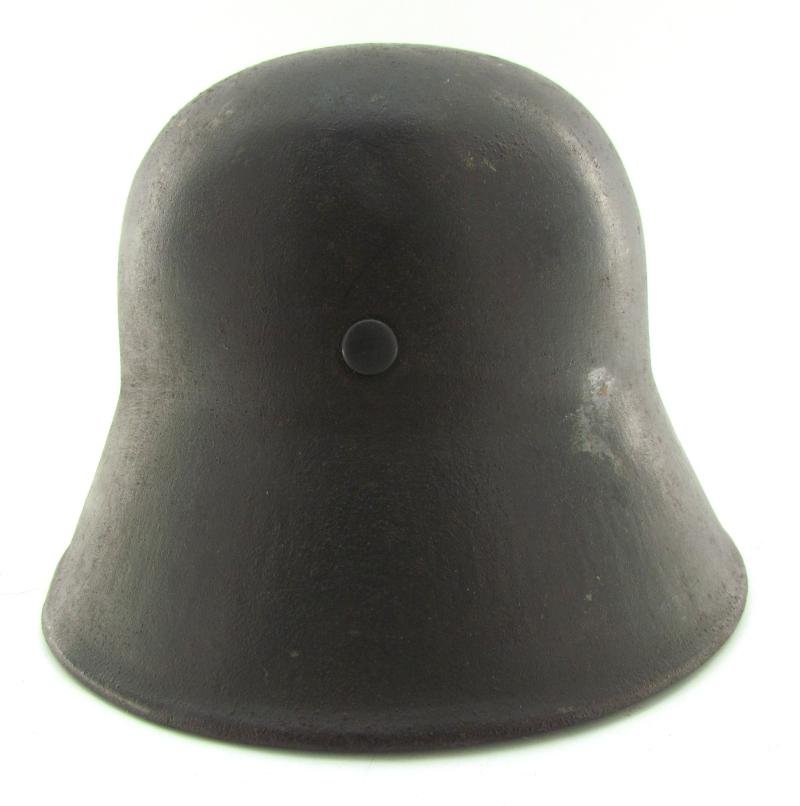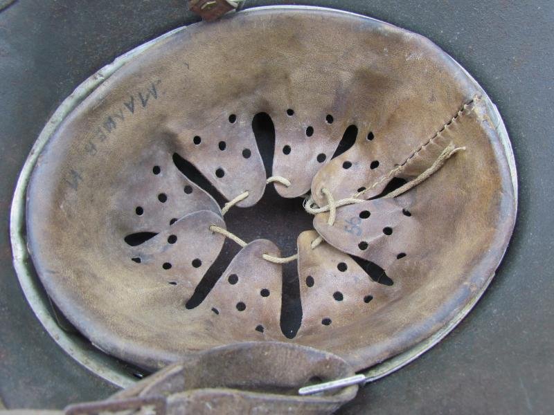 Wehrmacht M18 SD HelmetOriginal German M18 Stahlhelm, size ET64 (Eisenhüttenwerke Thale). This First World War produced helmet was later reissued in the 1930s, fitted with an early M31 aluminum liner and chinstrap for Reichswehr/Wehrmacht use.The helmet retains its original dark field finish with honest service wear. The liner shows natural age and patina, with the leather still intact.The shell is marked with maker and size 'ET64'. 'ET' is indicating production by the company of 'Eisen-und Hüttenwerke, AG' from Thale/Harz.A fine example of a WWI model reissued in the early Third Reich period