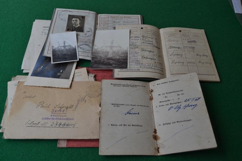 A group of seventeen items being, Fathers WW1 military pass dated 1916, awarded the Iron Cross 2nd class and another award, probably a wound badge, he was in Infantry Regiment Graf Bose plus his French Identity card, the Sons documents being his birth certificate, his arbeitsbuch with entries 1939 and 1940, Army Wehrpass dated 1941 for 3./Erz. Inf Erf Btl 125 and 2.J.R. 124, he was KIA in Russia 30.9.42, a postcard size picture showing Regiment number on his strap, two pictures of his grave and nine feldpost letters and cards with one stating he was killed. clean group.