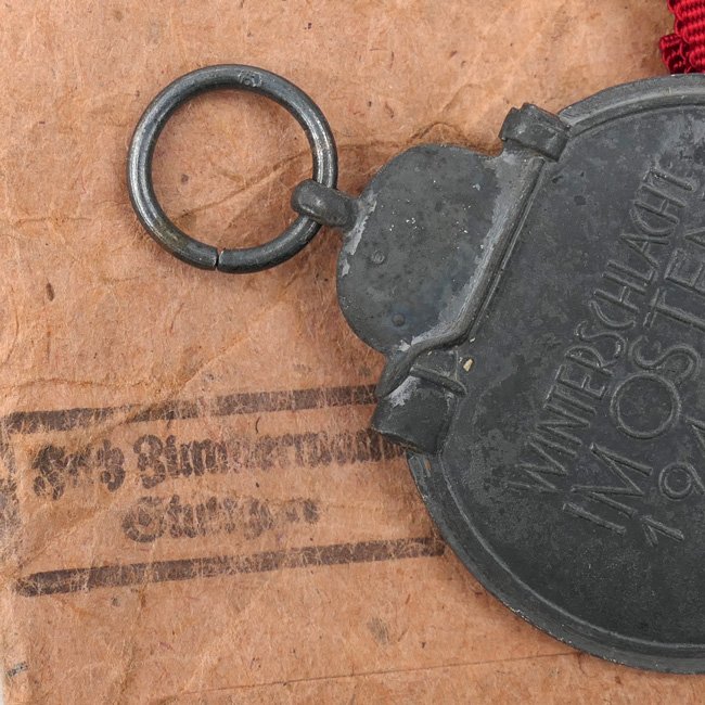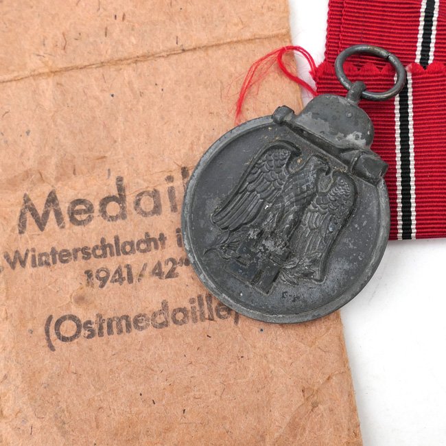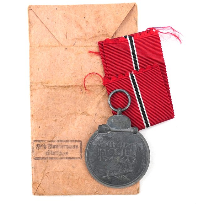 German Eastern Front Medal (Medaille fΓΌr die Winterschlacht im Osten) with carton Pouch. The German Eastern Front Medal was instituted on 26 May 1942 to commemorate the first winter campaign in Russia, operation Barbarossa. The medal was also known as the 'Frozen Meat Medal'. Approximately 3 million examples have been awarded. The medal comes with its original ribbon and carton pouch as found together. Both the medal (6) and pouch are nicely maker marked by the company of 'Fritz Zimmermann' from Stuttgart. The pouch is in slightly damaged condition. Nice set in good used condition!