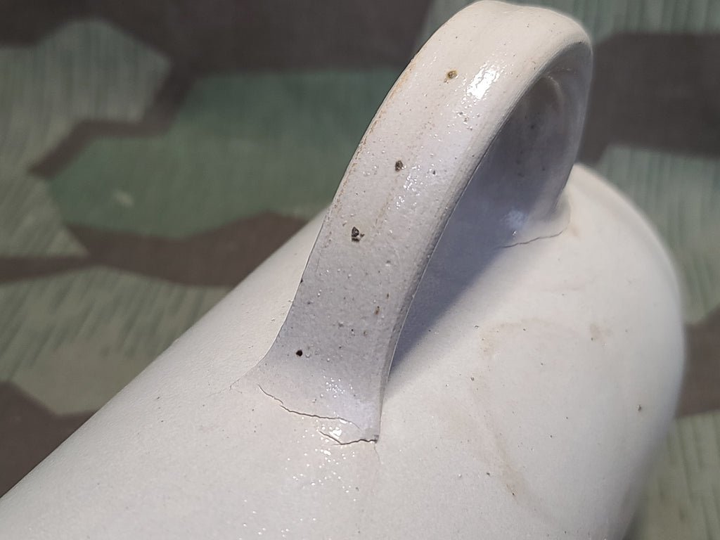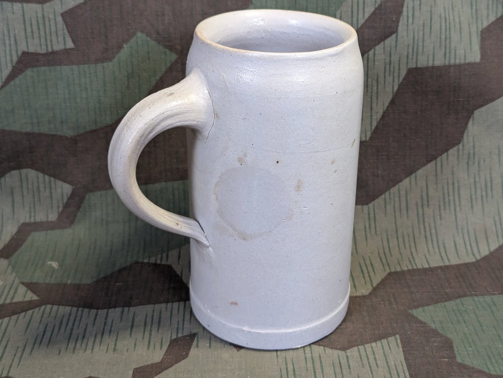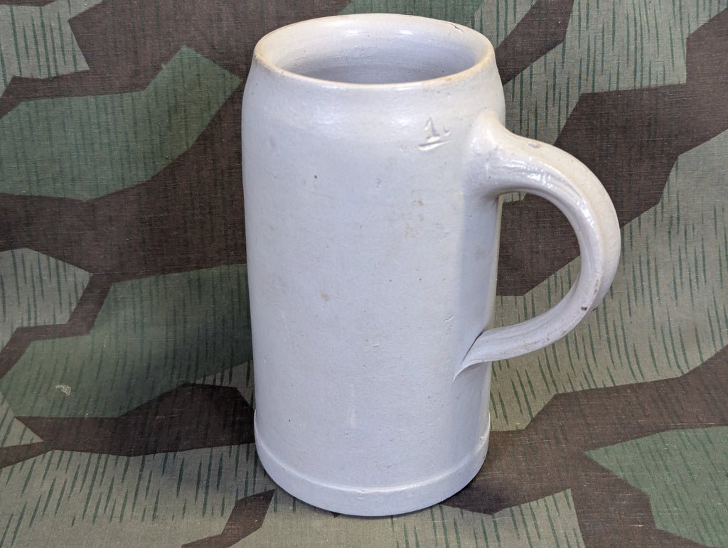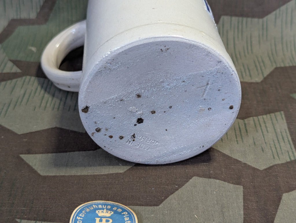 Vintage Hofbrรคu 1 liter krug. It is in overall good, usable, condition. There are some small 'cracks' by the handle - they are not all the way through and almost look like a flaw in the glaze rather than a 'break'. Some specks and discoloration.Great item for events to help eliminate farby bottles. This is an older style, but is post war made. Marked Made in Germany on the bottom.This is a krug, not a stein. Stein is what English speakers and tourists say. In German asteinis a stone. This is a beverage container, not a rock!