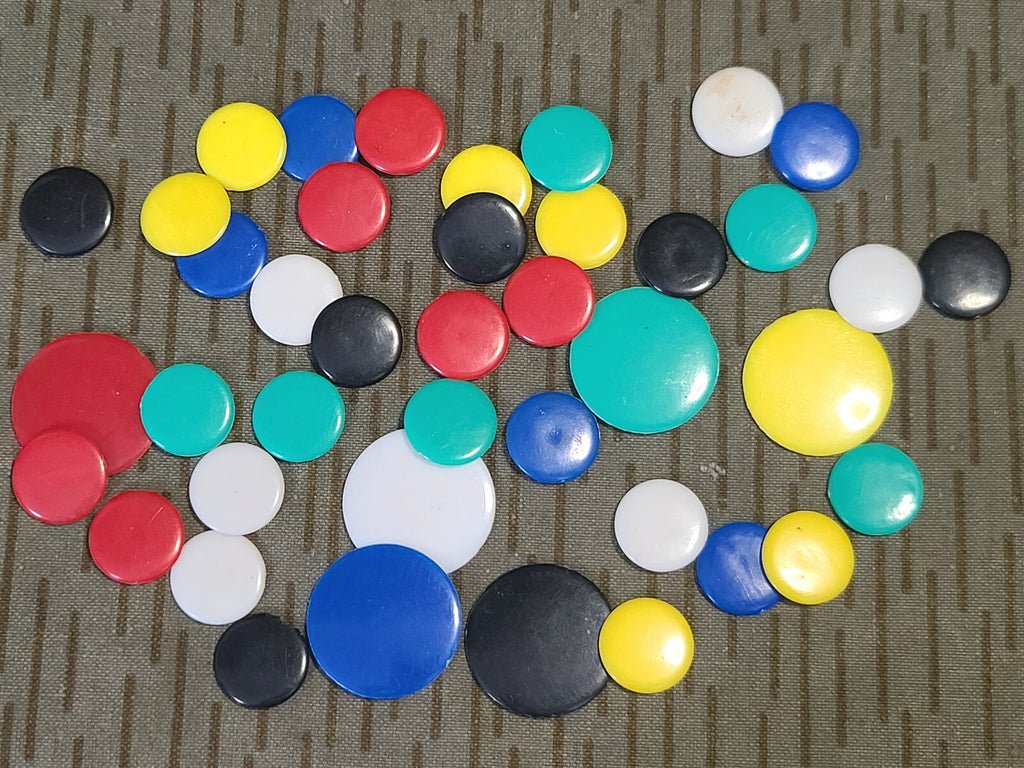 East German Knips-Spiel game. Probably 1950s. Bakelite container marked WARI. Inside are small colorful plastic discs and game instructions. One small blue disc looks to be missing and some discs are a little dirty. The label on the top is ripped.The Knips-Spiel game itself is actually older and dates back to the late 1800s. The colorful plastic discs do begin to appear in the game set in the 1930s, so despite looking very post war, they are actually quite similar to what you might see HJ kids playing with. This seems to have been a fairly common game as I have come across a lot of them over the years. I had always written it off as post war and it wasn't until I happened to see a prewar set with dateable markings that I looked into it more.More East German items here.