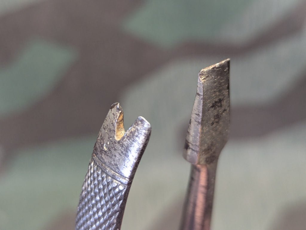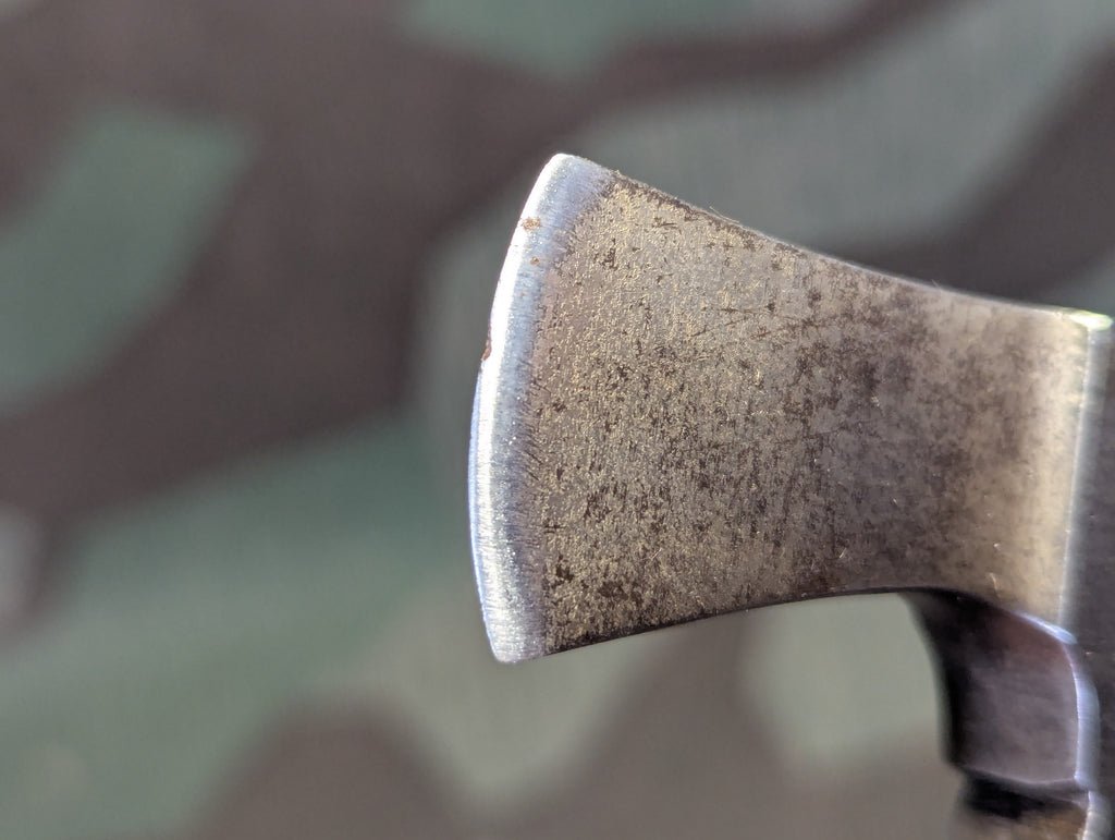 Original German multi tool commonly used for communications and pioneer work. It has some light wear from use and age. The hammer head looks to be the most used part and it's still pretty nice. The screw driver bit is a little twisted and worn. The axe part seems to have been sharpened a bit.Marked Crown Cutlery Co Germany.This is a medium sized one. I know of probably about 3 or 4 different sizes.