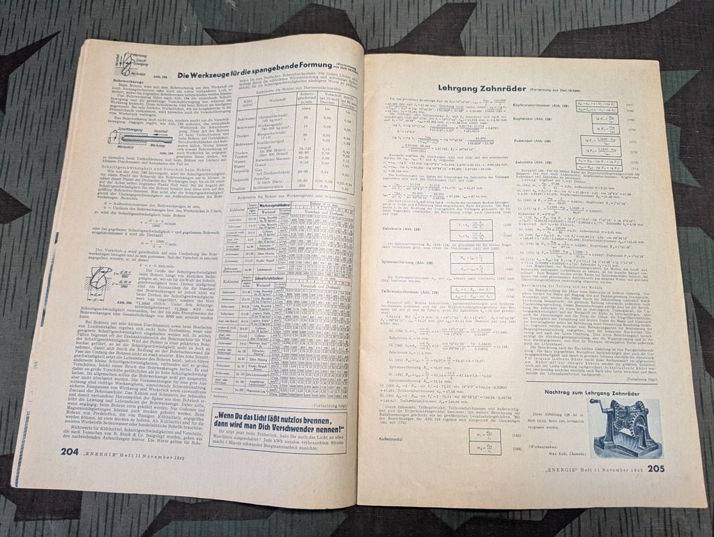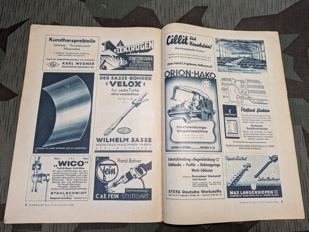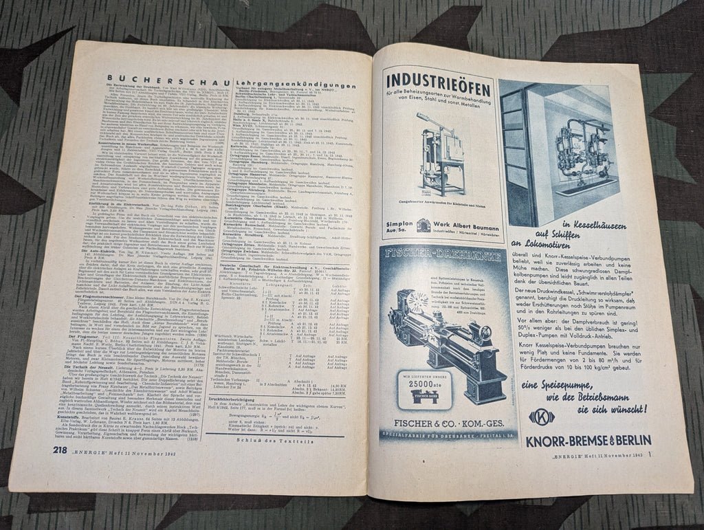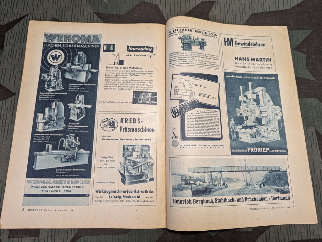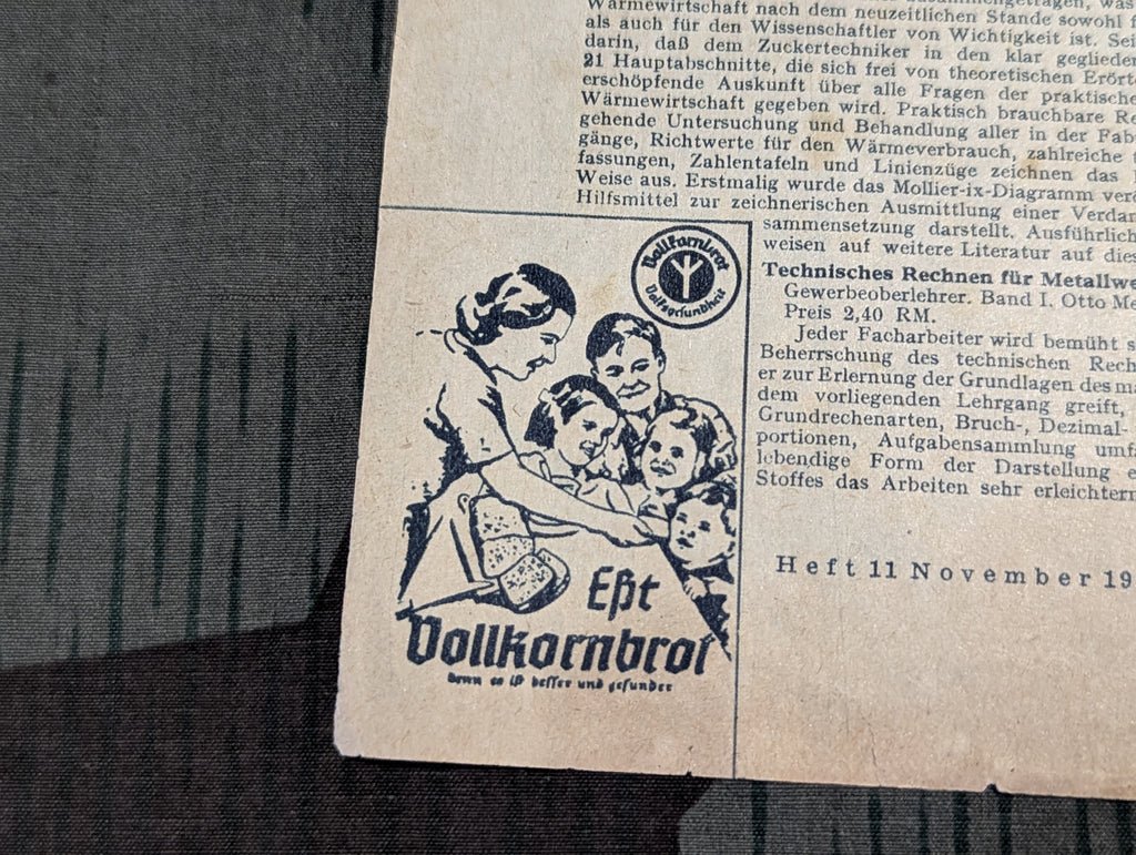 Original 1943 Energie technical profession magazine. This issue is a bit less interesting than the last one I listed, it is a lot more dry and and informational. This is not a Popular Science type magazine full of big ideas and fantasy, it is a grounded serious publication for people that are really into machining. There is one very nice little find in here though, an ad for Vollkornbrot from the same manufacturer that produced the somewhat famous brot boxes you might be familiar with.