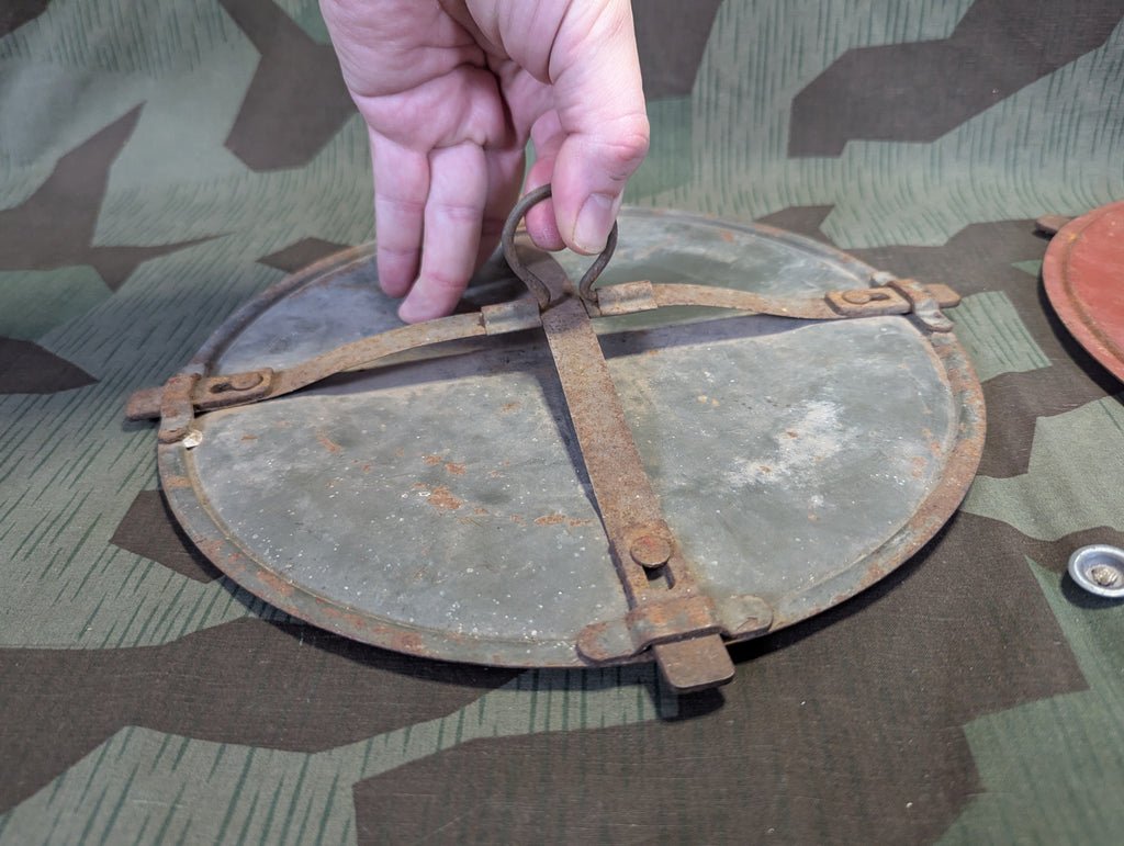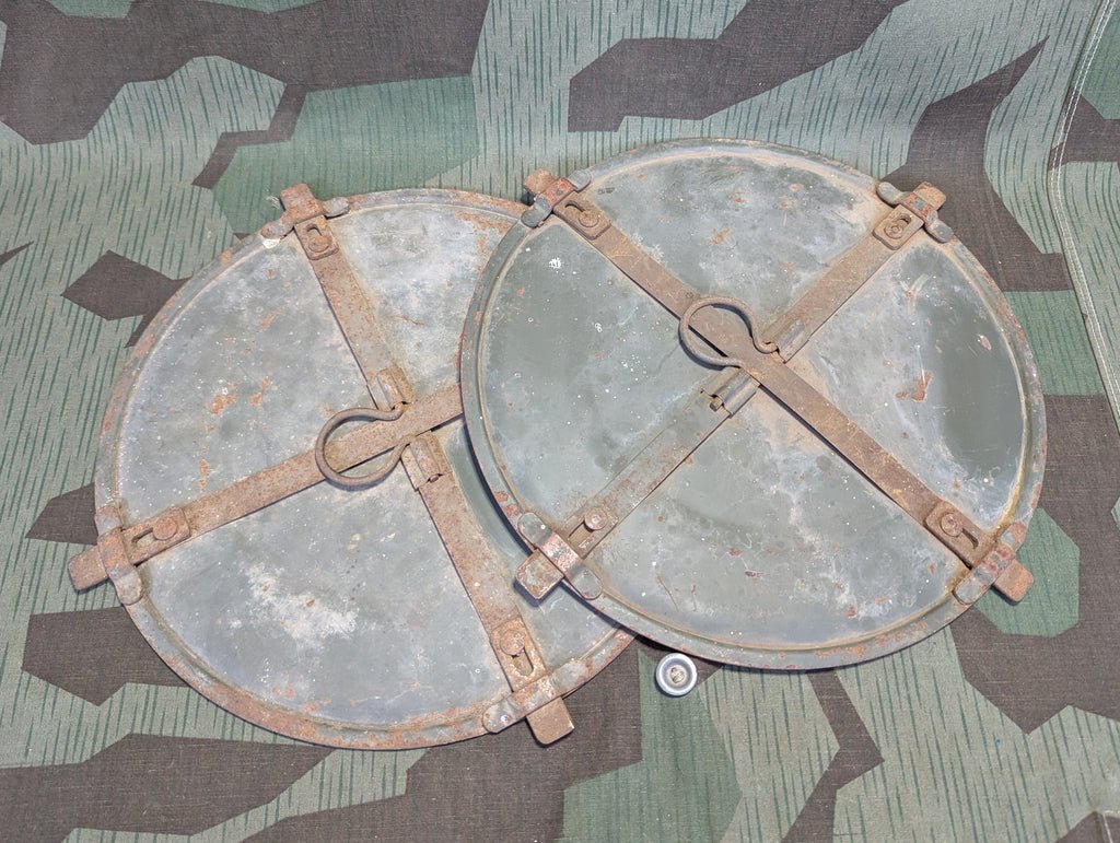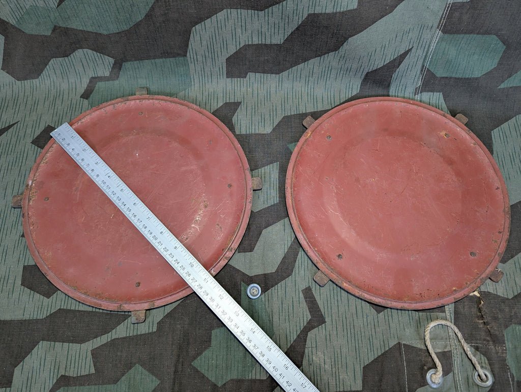 Original lids for the rations drop canisters. Part of the Verpflegungsbombe. These would close off the individual small round dry goods canisters. There were a few different style of this canister. This should fit yours if your can has 4 latch loops around the opening. In original paint. fairly good condition, just a bit dirty with some rust.Price is for one.
