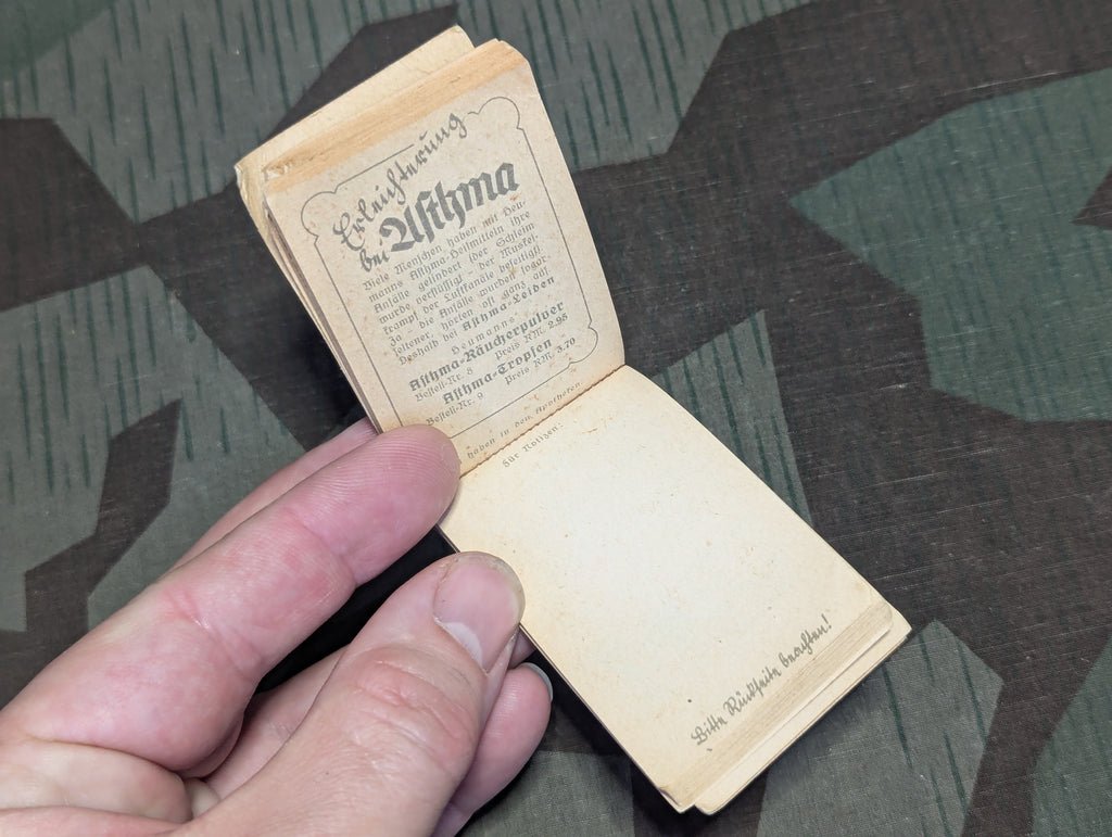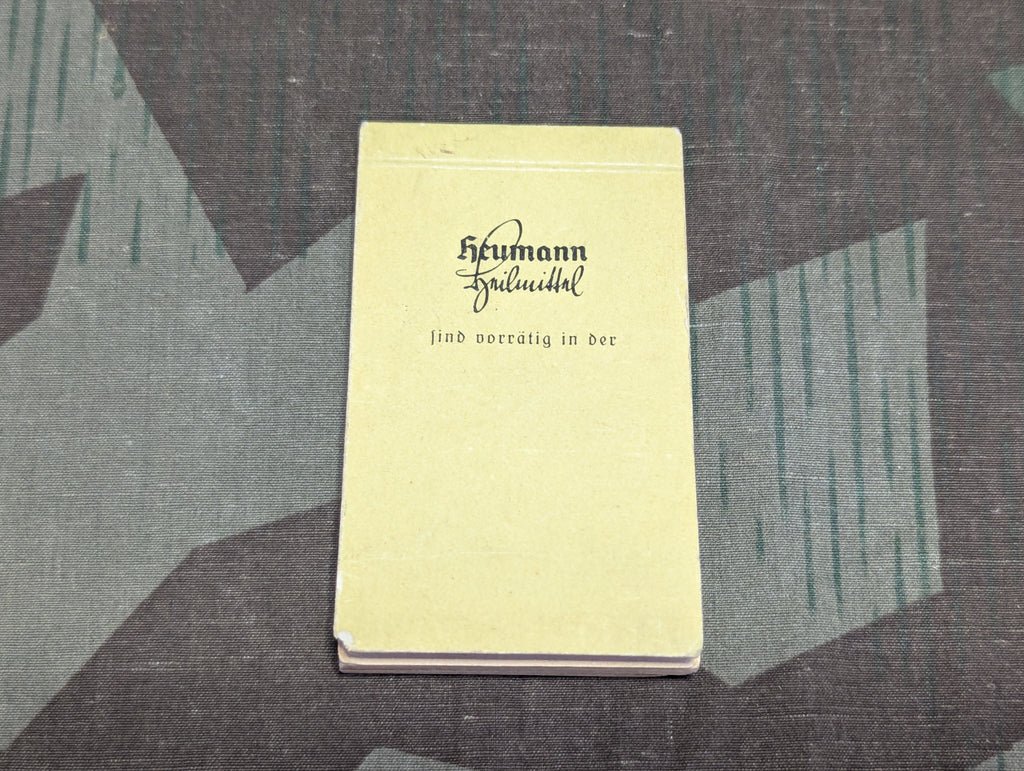 Original Heumann Heilmittel small advertisement notebook. It decent condition. The cover has pulled away a bit, but is still attached. This style notebook is typically for medicine - just like all the stationary and promotional things you see these days from various pharma companies. This one however almost seems more like a supplement or similar product which attempts to be medicinal.