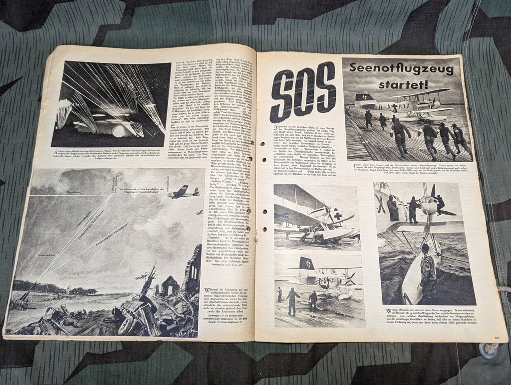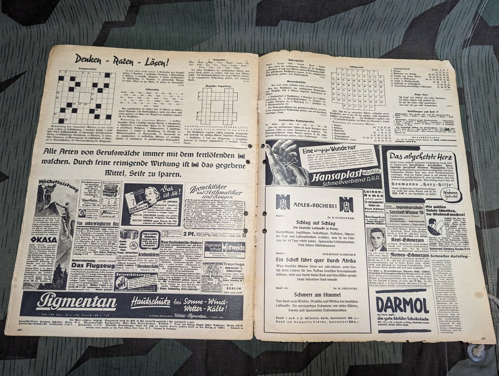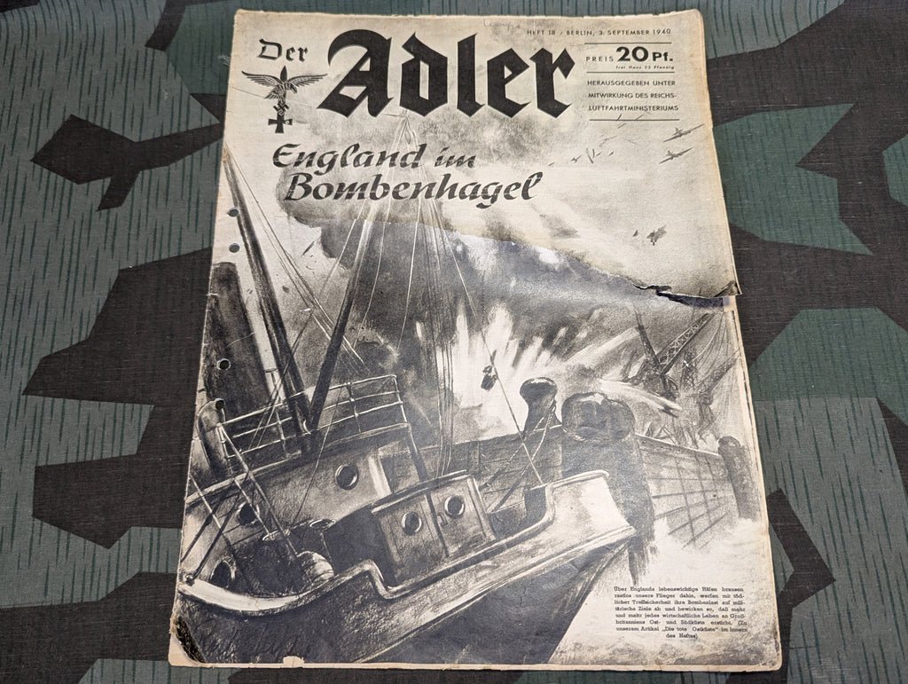 Original Der Adler magazine from 3 September 1940. In German. Damaged condition with a big tear on the cover. The cover is unfortunate, as this one has some really good ads. Holes punched on the side.