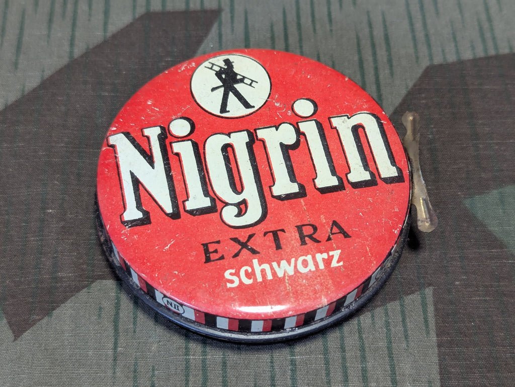 Price is for one tin.Period deadstock German black shoe polish in decent condition with the original polish inside. Based on some of the other tins that were mixed in with this lot, I believe these are probably pre war. The little key built onto the side of the tin for opening it is also as early style but this type was used both before and immediately after the war. Each tin contains a puck of shoe polish. All are in fairly good condition with some fading and other age related wear. The pucks of shoe polish vary in size, which is a result of inconsistent shrinkage.
