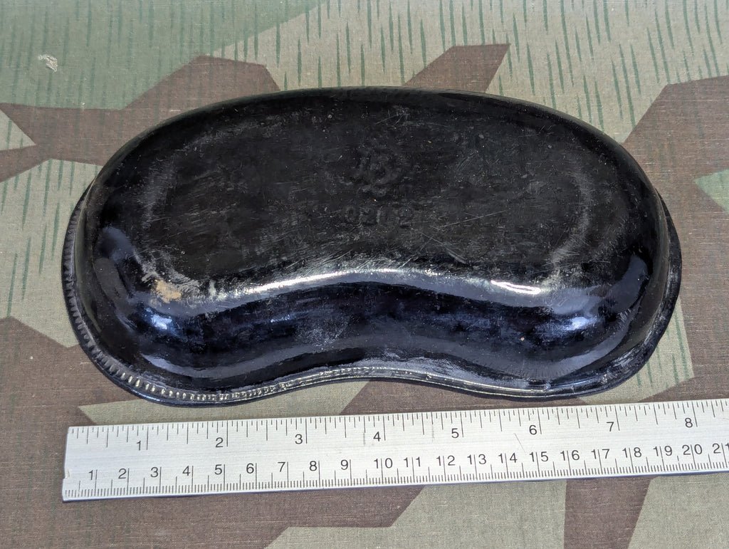 Interesting German emesis basin made out of an odd material. It feels like a very heavily impregnated paper based material.This kidney-bean shaped dishis used in medical and surgical wards to receive soiled dressings and other medical waste. The shape of the dish allows it to be held against the patient's body to catch any falling fluids or debris (when washing out a small wound, for example).In good condition with light general wear. Maker marked on the bottom.