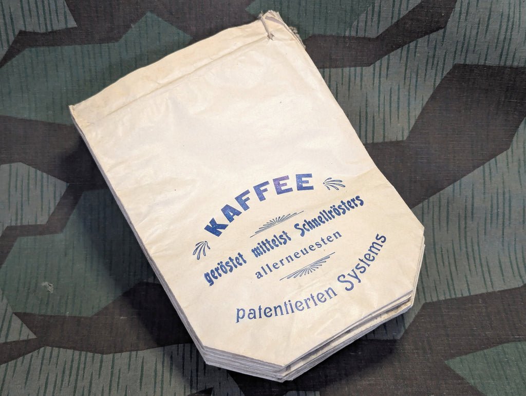 Price is for one packet of original paper coffee sales bags. Kaffee geröstet mittelst Schnellrösters allerneuesten patentierten Systems (coffee roasted using the latest rapid roaster patented system) I am not sure how many a full bundle would have had, but these seem to vary a little bit around 30-40 bags. Some might even have more.They are in OK condition with some storage wear, dirt, discoloration and staining. The bundles are held together by a little string loop.